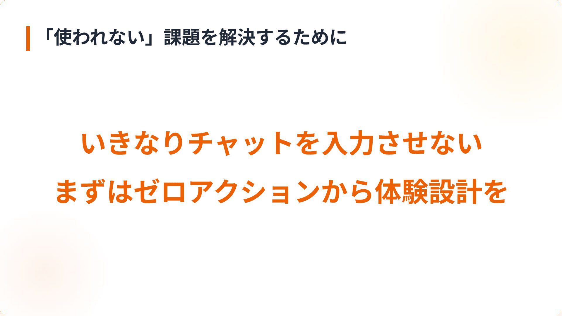いきなりチャットを⼊⼒させない まずはゼロアクションから体験設計を 「使われない」課題を解決するために