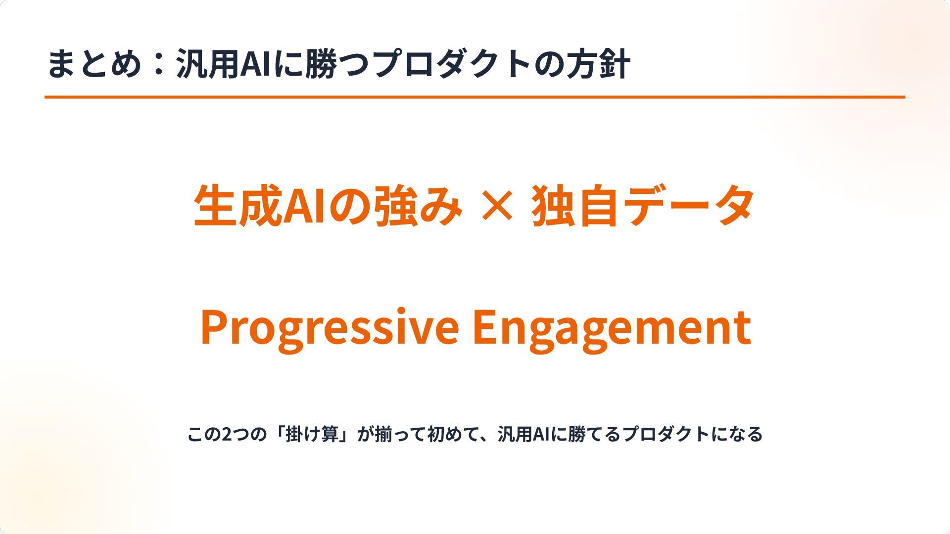 この2つの「掛け算」が揃って初めて、汎⽤AIに勝てるプロダクトになる まとめ:汎⽤AIに勝つプロダクトの⽅針 ⽣成AIの強み × 独⾃データ Progressive Engagement