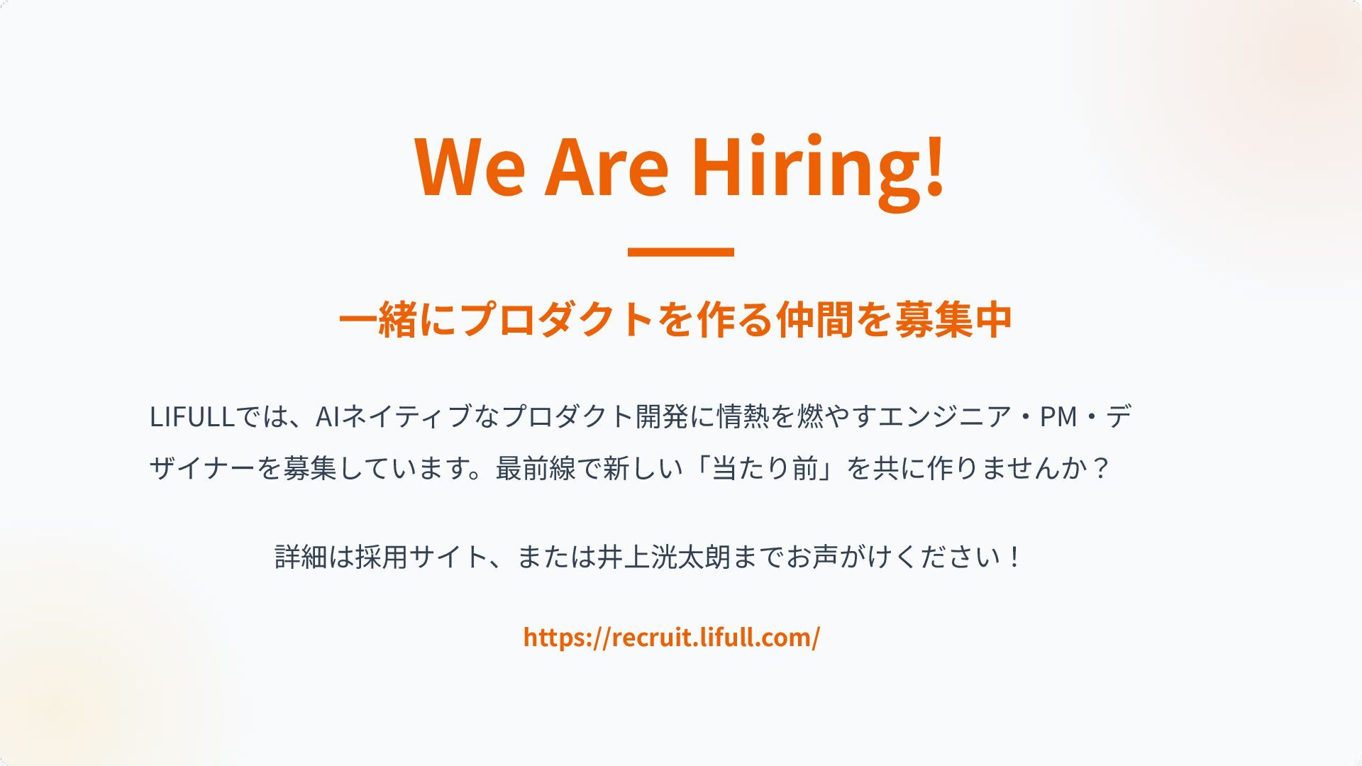 We Are Hiring! ⼀緒にプロダクトを作る仲間を募集中 LIFULLでは、AIネイティブなプロダクト開発に情熱を燃やすエンジニア‧PM‧デ ザイナーを募集しています。最前線で新しい「当たり前」を共に作りませんか? 詳細は採⽤サイト、または井上洸太朗までお声がけください! https://recruit.lifull.com/