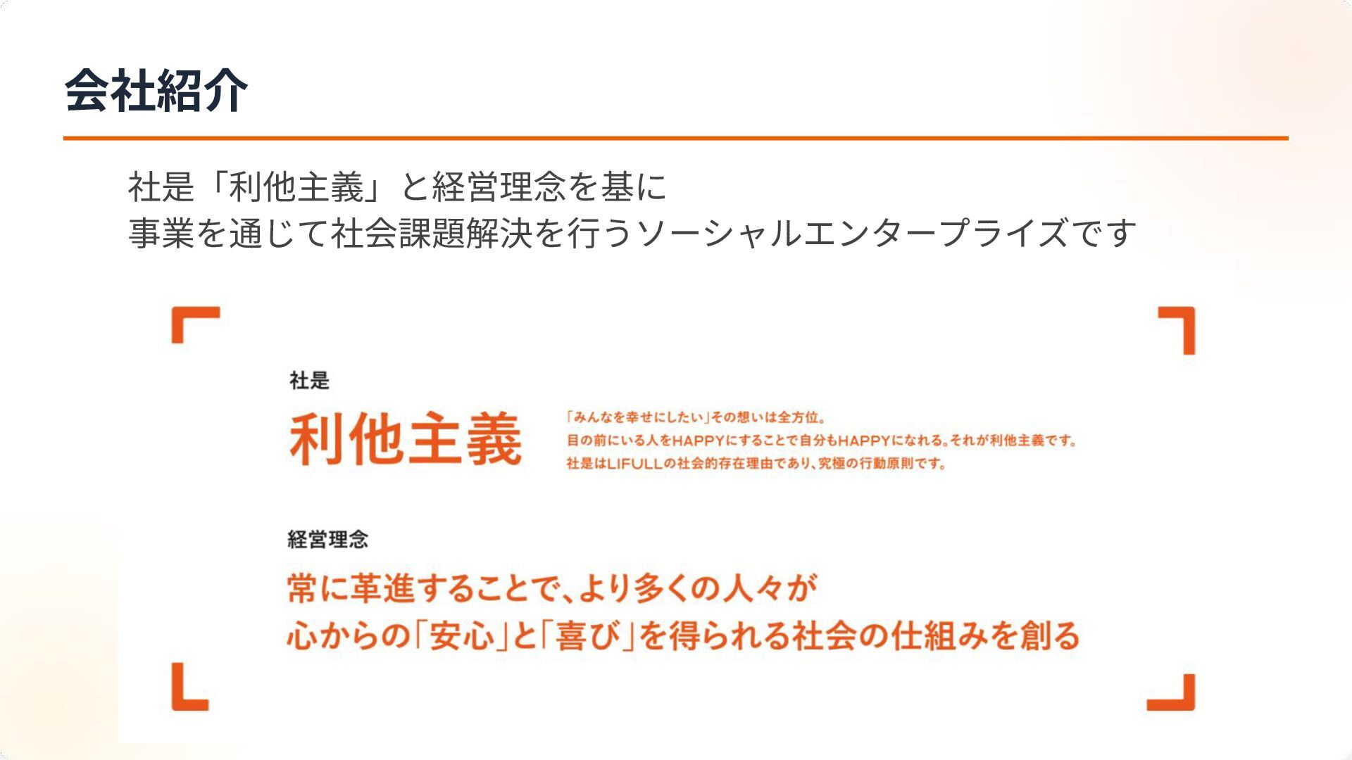 会社紹介 社是「利他主義」と経営理念を基に 事業を通じて社会課題解決を⾏うソーシャルエンタープライズです