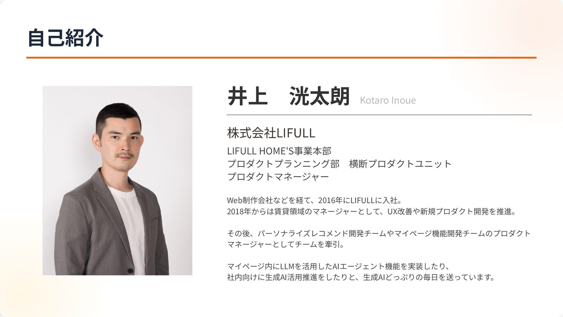 ⾃⼰紹介 Web制作会社などを経て、2016年にLIFULLに⼊社。 2018年からは賃貸領域のマネージャーとして、UX改善や新規プロダクト開発を推進。 その後、パーソナライズレコメンド開発チームやマイページ機能開発チームのプロダクト マネージャーとしてチームを牽引。 マイページ内にLLMを活⽤したAIエージェント機能を実装したり、 社内向けに⽣成AI活⽤推進をしたりと、⽣成AIどっぷりの毎⽇を送っています。 株式会社LIFULL LIFULL HOME'S事業本部