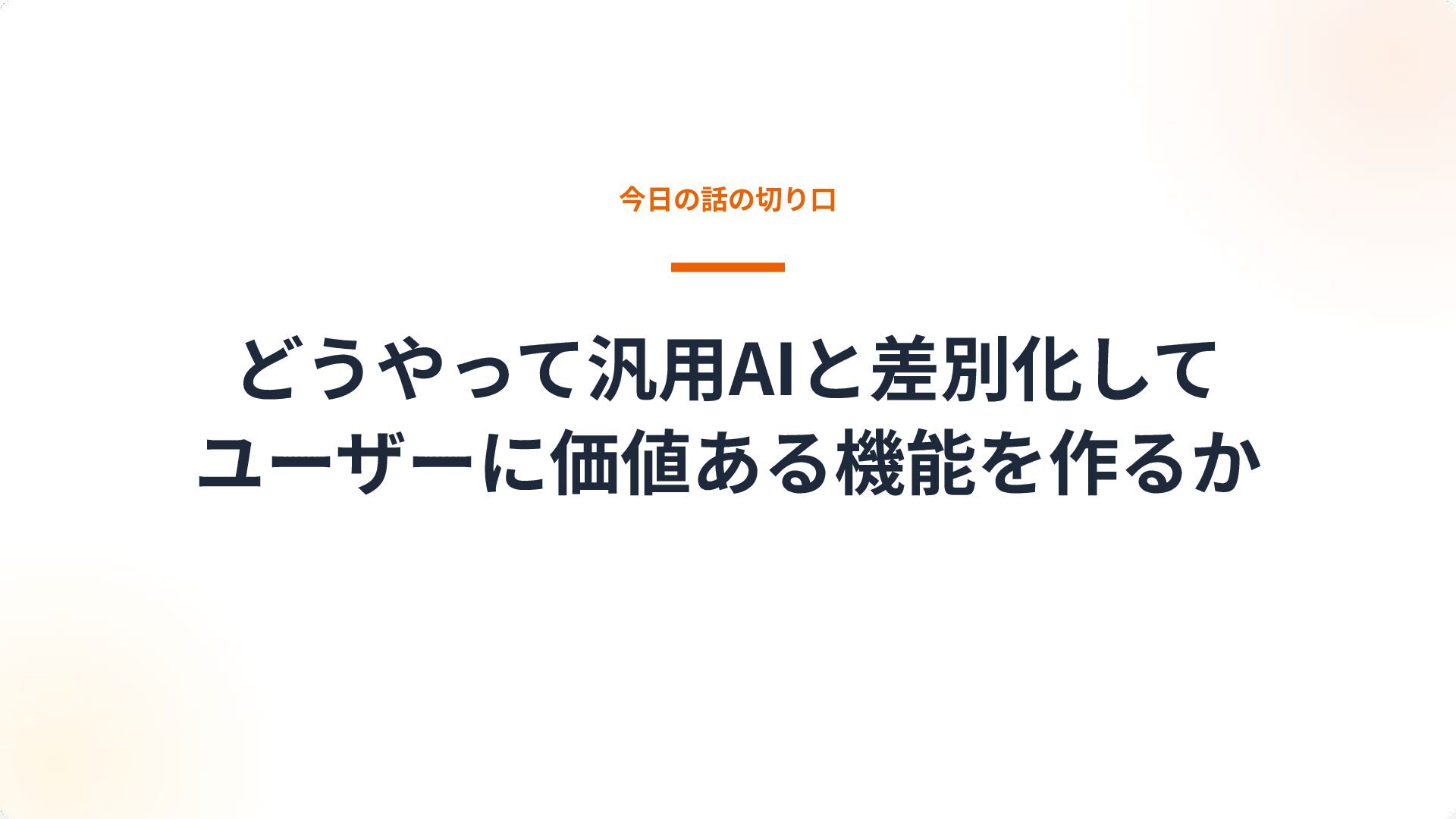 どうやって汎⽤AIと差別化して ユーザーに価値ある機能を作るか 今⽇の話の切り⼝