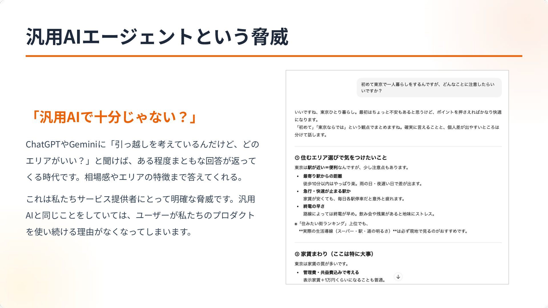 「汎⽤AIで⼗分じゃない?」 ChatGPTやGeminiに「引っ越しを考えているんだけど、どの エリアがいい?」と聞けば、ある程度まともな回答が返って くる時代です。相場感やエリアの特徴まで答えてくれる。 これは私たちサービス提供者にとって明確な脅威です。汎⽤ AIと同じことをしていては、ユーザーが私たちのプロダクト を使い続ける理由がなくなってしまいます。 汎⽤AIエージェントという脅威