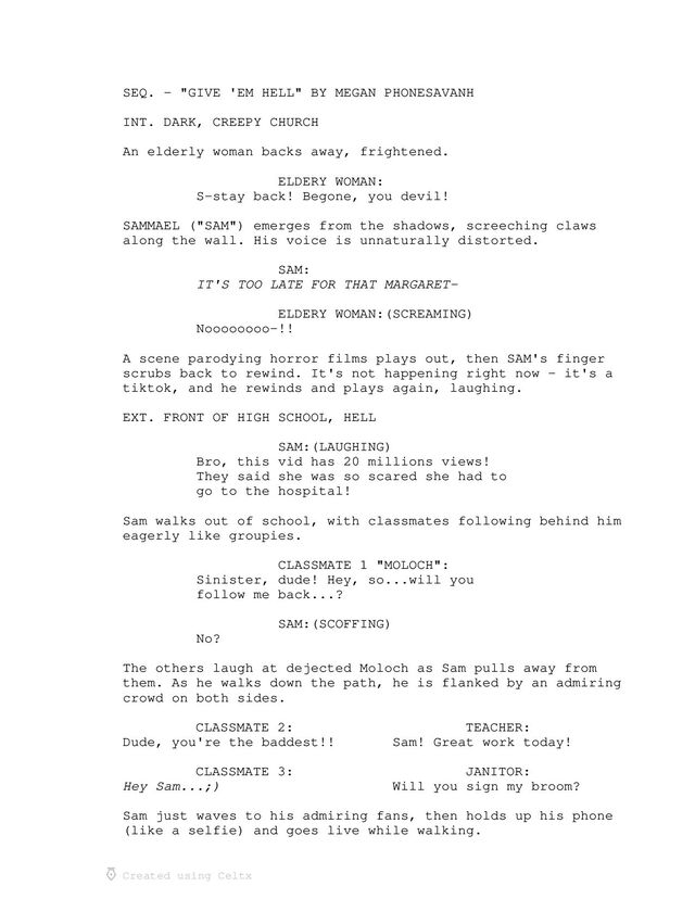 PHONESAVANH INT. DARK, CREEPY CHURCH An elderly woman backs away, frightened. ELDERY WOMAN: S-stay back! Begone, you devil! SAMMAEL ("SAM") emerges from the shadows, screeching claws along the wall. His voice is unnaturally distorted. SAM: IT'S TOO LATE FOR THAT MARGARET- ELDERY WOMAN:(SCREAMING) Noooooooo-!! A scene parodying horror films plays out, then SAM's finger scrubs back to rewind. It's not happening right now - it's a tiktok, and he rewinds and plays again, laughing. EXT. FRONT OF HIGH SCHOOL, HELL SAM:(LAUGHING) Bro, this vid has 20 millions views! They said she was so scared she had to go to the hospital! Sam walks out of school, with classmates following behind him eagerly like groupies. CLASSMATE 1 "MOLOCH": Sinister, dude! Hey, so...will you follow me back...? SAM:(SCOFFING) No? The others laugh at dejected Moloch as Sam pulls away from them. As he walks down the path, he is flanked by an admiring crowd on both sides. CLASSMATE 2: Dude, you're the baddest!! TEACHER: Sam! Great work today! CLASSMATE 3: Hey Sam...;) JANITOR: Will you sign my broom? Sam just waves to his admiring fans, then holds up his phone (like a selfie) and goes live while walking.