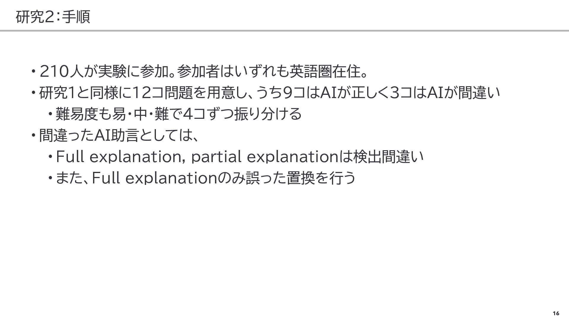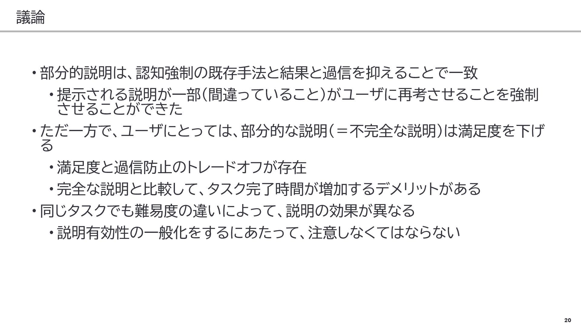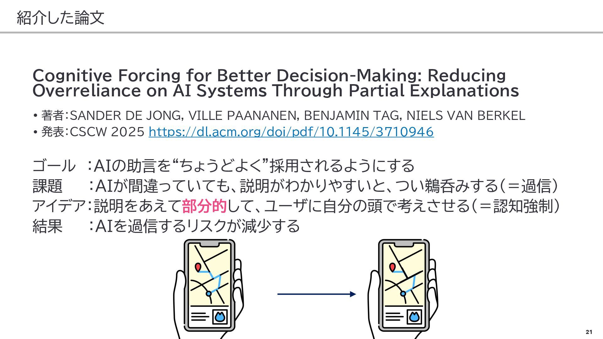 AI Systems Through Partial Explanations • 著者:SANDER DE JONG, VILLE PAANANEN, BENJAMIN TAG, NIELS VAN BERKEL • 発表:CSCW 2025 https://dl.acm.org/doi/pdf/10.1145/3710946 ゴール :AIの助言を“ちょうどよく”採用されるようにする 課題 :AIが間違っていても、説明がわかりやすいと、つい鵜呑みする(=過信) アイデア:説明をあえて部分的して、ユーザに自分の頭で考えさせる(=認知強制) 結果 :AIを過信するリスクが減少する