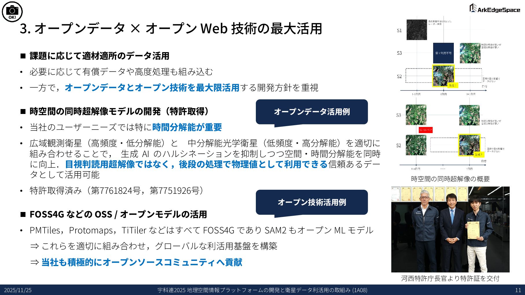 • 一方で,オープンデータとオープン技術を最大限活用する開発方針を重視 時空間の同時超解像モデルの開発(特許取得) • 当社のユーザーニーズでは特に時間分解能が重要 • 広域観測衛星(高頻度・低分解能)と 中分解能光学衛星(低頻度・高分解能)を適切に 組み合わせることで, 生成 AI のハルシネーションを抑制しつつ空間・時間分解能を同時 に向上.目視判読用超解像ではなく,後段の処理で物理値として利用できる信頼あるデー タとして活用可能 • 特許取得済み(第7761824号,第7751926号) FOSS4G などの OSS / オープンモデルの活用 • PMTiles,Protomaps,TiTiler などはすべて FOSS4G であり SAM2 もオープン ML モデル ⇒ これらを適切に組み合わせ,グローバルな利活用基盤を構築 ⇒ 当社も積極的にオープンソースコミュニティへ貢献 2025/11/25 宇科連2025 地理空間情報プラットフォームの開発と衛星データ利活用の取組み (1A08) 11 時空間の同時超解像の概要 河西特許庁長官より特許証を交付 オープンデータ活用例 オープン技術活用例
