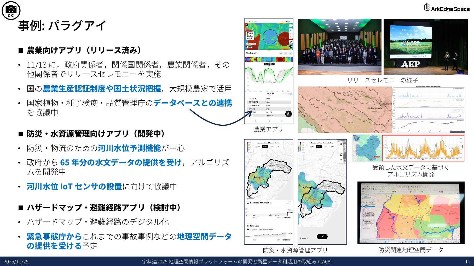 • 国家植物・種子検疫・品質管理庁のデータベースとの連携 を協議中 防災・水資源管理向けアプリ(開発中) • 防災・物流のための河川水位予測機能が中心 • 政府から 65 年分の水文データの提供を受け,アルゴリズ ムを開発中 • 河川水位 IoT センサの設置に向けて協議中 ハザードマップ・避難経路アプリ(検討中) • ハザードマップ・避難経路のデジタル化 • 緊急事態庁からこれまでの事故事例などの地理空間データ の提供を受ける予定 2025/11/25 宇科連2025 地理空間情報プラットフォームの開発と衛星データ利活用の取組み (1A08) 12 防災・水資源管理アプリ 農業アプリ 防災関連地理空間データ リリースセレモニーの様子 受領した水文データに基づく アルゴリズム開発