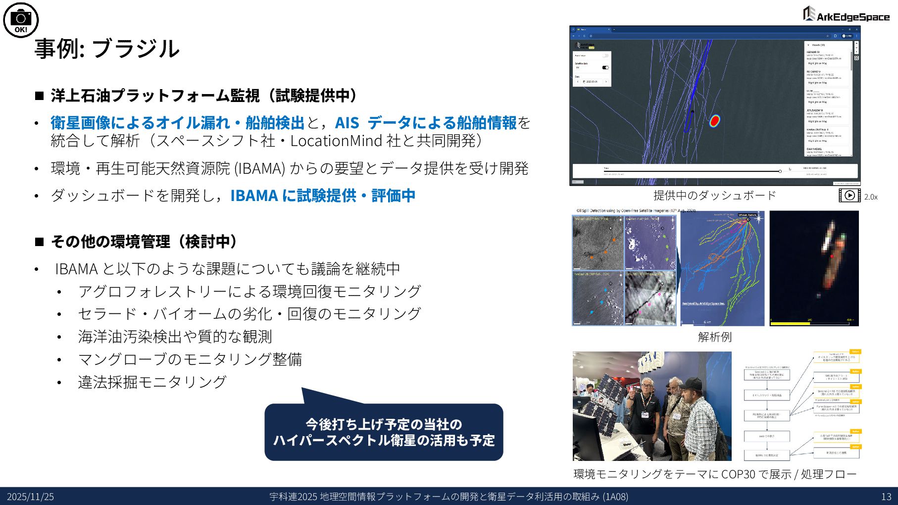 環境・再生可能天然資源院 (IBAMA) からの要望とデータ提供を受け開発 • ダッシュボードを開発し,IBAMA に試験提供・評価中 その他の環境管理(検討中) • IBAMA と以下のような課題についても議論を継続中 • アグロフォレストリーによる環境回復モニタリング • セラード・バイオームの劣化・回復のモニタリング • 海洋油汚染検出や質的な観測 • マングローブのモニタリング整備 • 違法採掘モニタリング 2025/11/25 宇科連2025 地理空間情報プラットフォームの開発と衛星データ利活用の取組み (1A08) 13 2.0x 今後打ち上げ予定の当社の ハイパースペクトル衛星の活用も予定 提供中のダッシュボード 環境モニタリングをテーマに COP30 で展示 / 処理フロー 解析例
