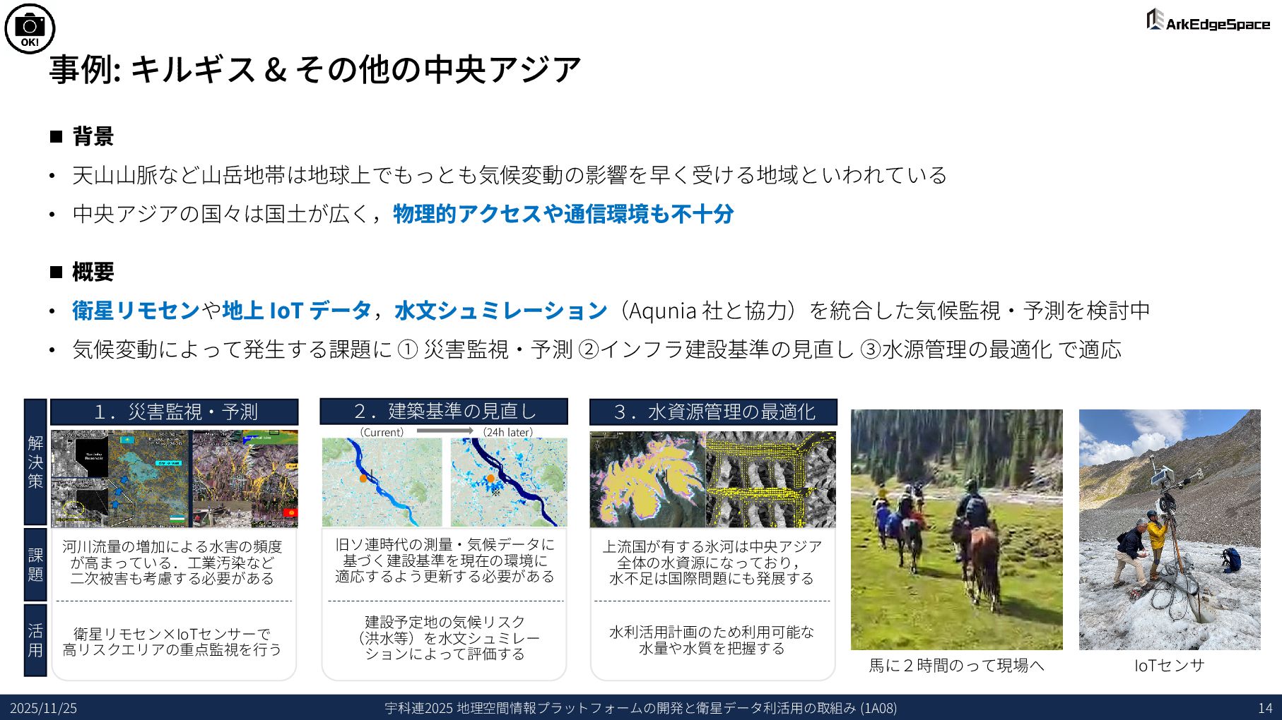 概要 • 衛星リモセンや地上 IoT データ,水文シュミレーション(Aqunia 社と協力)を統合した気候監視・予測を検討中 • 気候変動によって発生する課題に ① 災害監視・予測 ②インフラ建設基準の見直し ③水源管理の最適化 で適応 2025/11/25 宇科連2025 地理空間情報プラットフォームの開発と衛星データ利活用の取組み (1A08) 14 IoTセンサ 馬に2時間のって現場へ 1.災害監視・予測 2.建築基準の見直し 3.水資源管理の最適化 河川流量の増加による水害の頻度 が高まっている.工業汚染など 二次被害も考慮する必要がある 衛星リモセン×IoTセンサーで 高リスクエリアの重点監視を行う 旧ソ連時代の測量・気候データに 基づく建設基準を現在の環境に 適応するよう更新する必要がある 建設予定地の気候リスク (洪水等)を水文シュミレー ションによって評価する 上流国が有する氷河は中央アジア 全体の水資源になっており, 水不足は国際問題にも発展する 水利活用計画のため利用可能な 水量や水質を把握する 課 題 活 用 解 決 策 ※ (Current) (24h later)