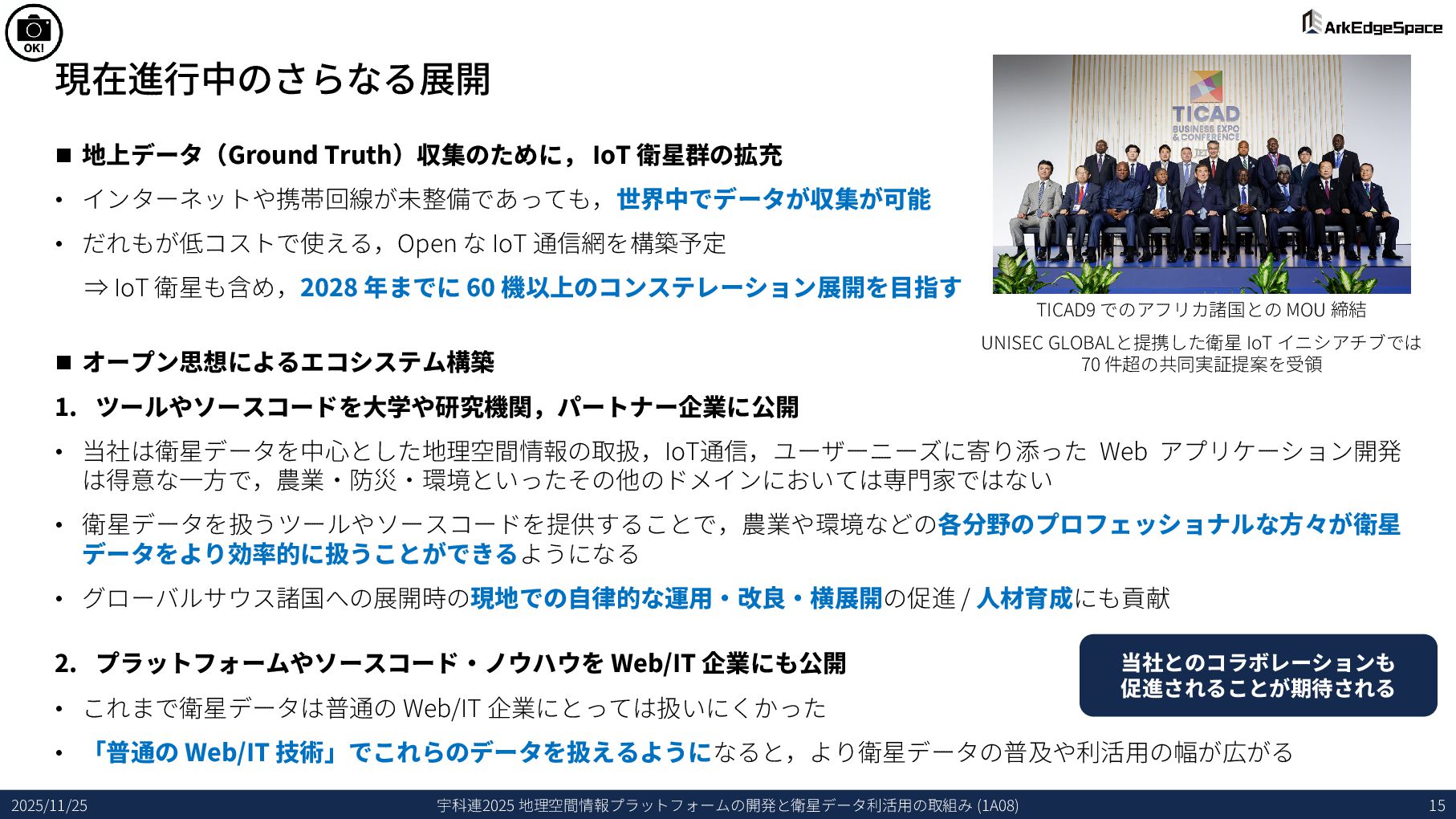な IoT 通信網を構築予定 ⇒ IoT 衛星も含め,2028 年までに 60 機以上のコンステレーション展開を目指す オープン思想によるエコシステム構築 1. ツールやソースコードを大学や研究機関,パートナー企業に公開 • 当社は衛星データを中心とした地理空間情報の取扱,IoT通信,ユーザーニーズに寄り添った Web アプリケーション開発 は得意な一方で,農業・防災・環境といったその他のドメインにおいては専門家ではない • 衛星データを扱うツールやソースコードを提供することで,農業や環境などの各分野のプロフェッショナルな方々が衛星 データをより効率的に扱うことができるようになる • グローバルサウス諸国への展開時の現地での自律的な運用・改良・横展開の促進 / 人材育成にも貢献 2. プラットフォームやソースコード・ノウハウを Web/IT 企業にも公開 • これまで衛星データは普通の Web/IT 企業にとっては扱いにくかった • 「普通の Web/IT 技術」でこれらのデータを扱えるようになると,より衛星データの普及や利活用の幅が広がる 2025/11/25 宇科連2025 地理空間情報プラットフォームの開発と衛星データ利活用の取組み (1A08) 15 TICAD9 でのアフリカ諸国との MOU 締結 UNISEC GLOBALと提携した衛星 IoT イニシアチブでは 70 件超の共同実証提案を受領 当社とのコラボレーションも 促進されることが期待される