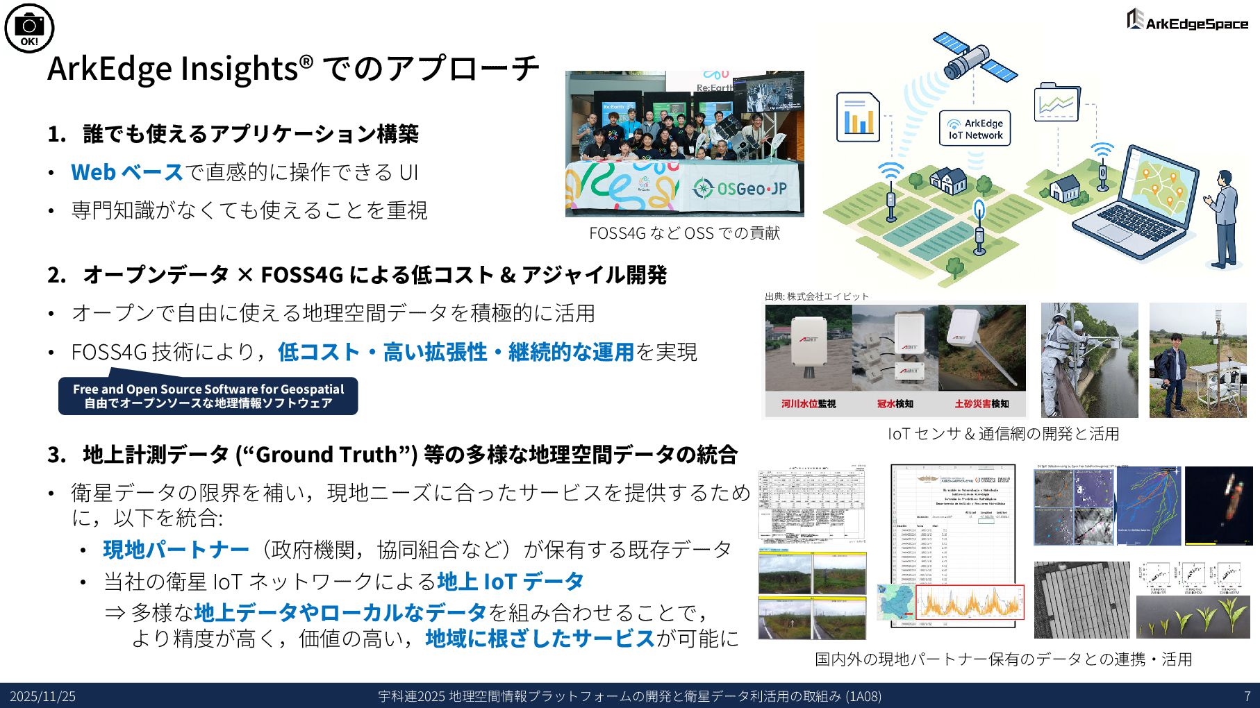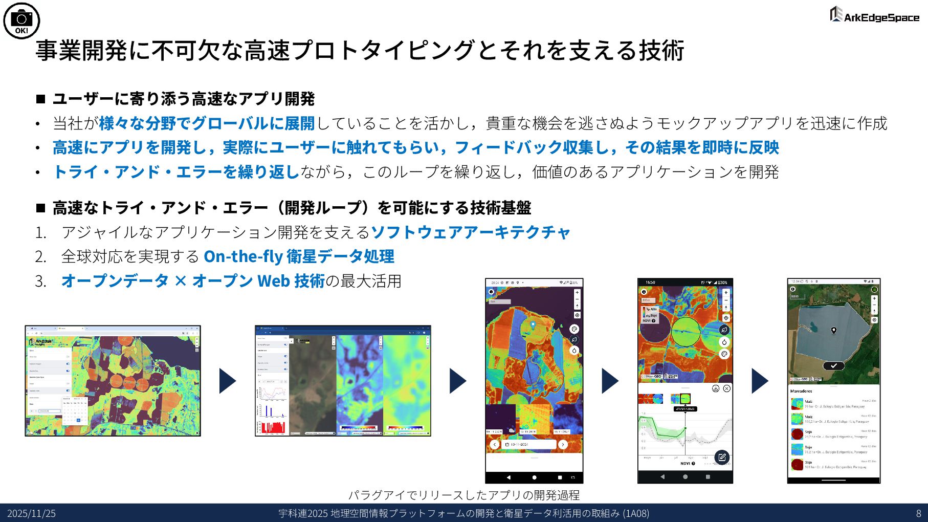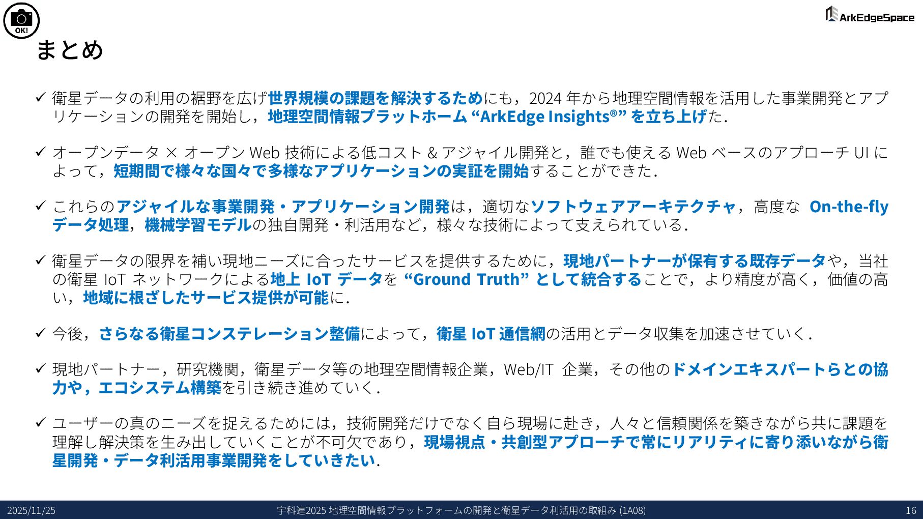 × オープン Web 技術による低コスト & アジャイル開発と,誰でも使える Web ベースのアプローチ UI に よって,短期間で様々な国々で多様なアプリケーションの実証を開始することができた. これらのアジャイルな事業開発・アプリケーション開発は,適切なソフトウェアアーキテクチャ,高度な On-the-fly データ処理,機械学習モデルの独自開発・利活用など,様々な技術によって支えられている. 衛星データの限界を補い現地ニーズに合ったサービスを提供するために,現地パートナーが保有する既存データや,当社 の衛星 IoT ネットワークによる地上 IoT データを “Ground Truth” として統合することで,より精度が高く,価値の高 い,地域に根ざしたサービス提供が可能に. 今後,さらなる衛星コンステレーション整備によって,衛星 IoT 通信網の活用とデータ収集を加速させていく. 現地パートナー,研究機関,衛星データ等の地理空間情報企業,Web/IT 企業,その他のドメインエキスパートらとの協 力や,エコシステム構築を引き続き進めていく. ユーザーの真のニーズを捉えるためには,技術開発だけでなく自ら現場に赴き,人々と信頼関係を築きながら共に課題を 理解し解決策を生み出していくことが不可欠であり,現場視点・共創型アプローチで常にリアリティに寄り添いながら衛 星開発・データ利活用事業開発をしていきたい. 2025/11/25 宇科連2025 地理空間情報プラットフォームの開発と衛星データ利活用の取組み (1A08) 16