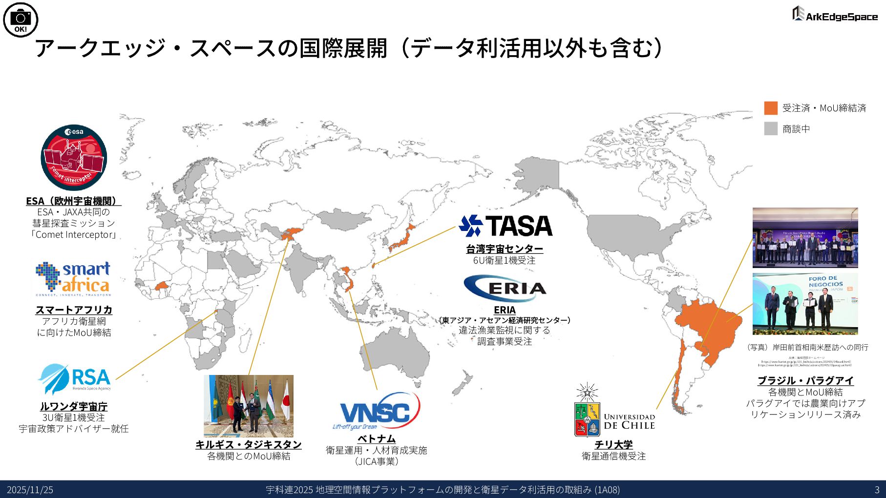 アークエッジ・スペースの国際展開(データ利活用以外も含む) 2025/11/25 宇科連2025 地理空間情報プラットフォームの開発と衛星データ利活用の取組み (1A08) 3 受注済・MoU締結済 商談中 ブラジル・パラグアイ 各機関とMoU締結