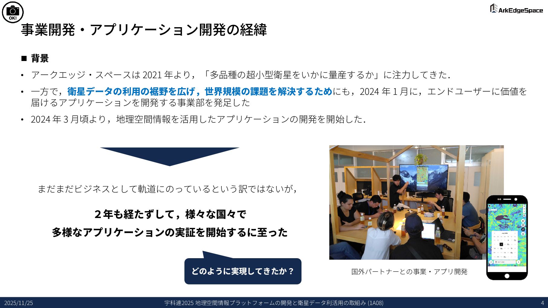 事業開発・アプリケーション開発の経緯 背景 • アークエッジ・スペースは 2021 年より,「多品種の超小型衛星をいかに量産するか」に注力してきた. • 一方で,衛星データの利用の裾野を広げ,世界規模の課題を解決するためにも,2024 年