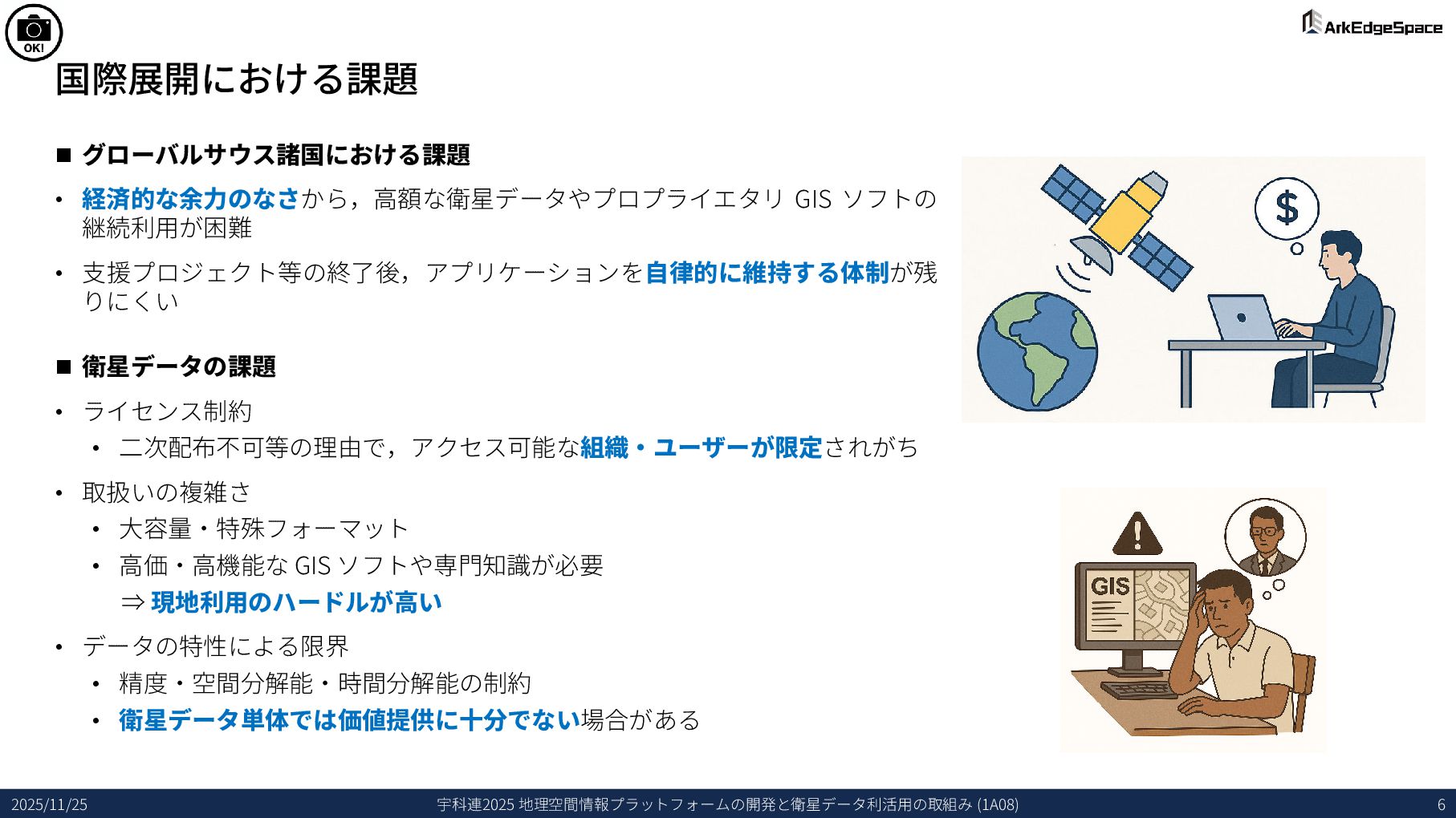 国際展開における課題 グローバルサウス諸国における課題 • 経済的な余力のなさから,高額な衛星データやプロプライエタリ GIS ソフトの 継続利用が困難 • 支援プロジェクト等の終了後,アプリケーションを自律的に維持する体制が残