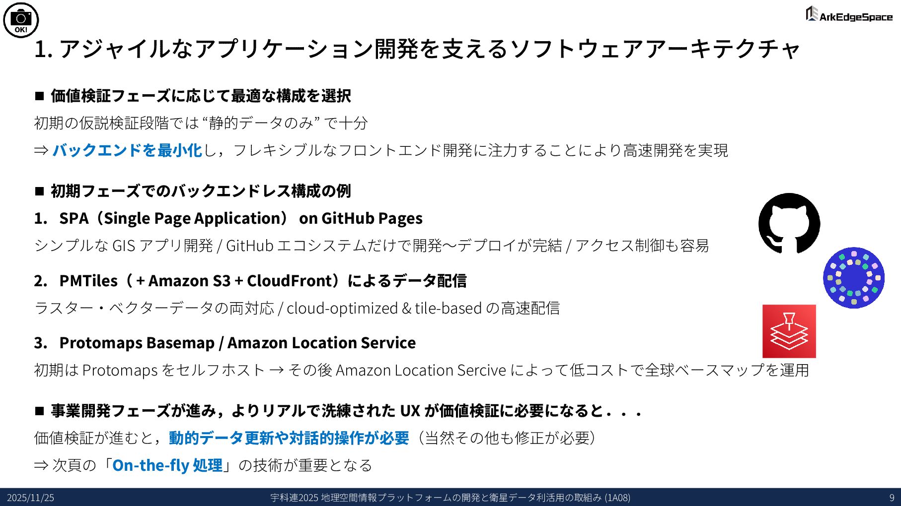初期フェーズでのバックエンドレス構成の例 1. SPA(Single Page Application) on GitHub Pages シンプルな GIS アプリ開発 / GitHub エコシステムだけで開発〜デプロイが完結 / アクセス制御も容易 2. PMTiles( + Amazon S3 + CloudFront)によるデータ配信 ラスター・ベクターデータの両対応 / cloud-optimized & tile-based の高速配信 3. Protomaps Basemap / Amazon Location Service 初期は Protomaps をセルフホスト → その後 Amazon Location Sercive によって低コストで全球ベースマップを運用 事業開発フェーズが進み,よりリアルで洗練された UX が価値検証に必要になると... 価値検証が進むと,動的データ更新や対話的操作が必要(当然その他も修正が必要) ⇒ 次頁の「On-the-fly 処理」の技術が重要となる 2025/11/25 宇科連2025 地理空間情報プラットフォームの開発と衛星データ利活用の取組み (1A08) 9