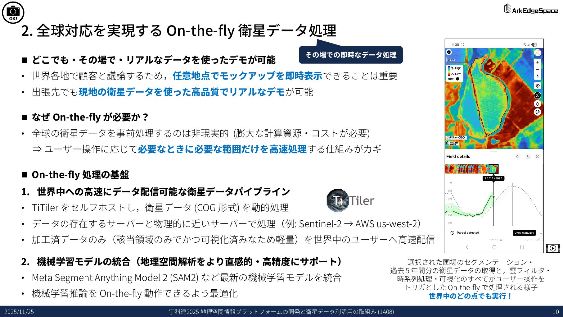 • 全球の衛星データを事前処理するのは非現実的 (膨大な計算資源・コストが必要) ⇒ ユーザー操作に応じて必要なときに必要な範囲だけを高速処理する仕組みがカギ On-the-fly 処理の基盤 1. 世界中への高速にデータ配信可能な衛星データパイプライン • TiTiler をセルフホストし,衛星データ (COG 形式) を動的処理 • データの存在するサーバーと物理的に近いサーバーで処理(例: Sentinel-2 → AWS us-west-2) • 加工済データのみ(該当領域のみでかつ可視化済みなため軽量)を世界中のユーザーへ高速配信 2. 機械学習モデルの統合(地理空間解析をより直感的・高精度にサポート) • Meta Segment Anything Model 2 (SAM2) など最新の機械学習モデルを統合 • 機械学習推論を On-the-fly 動作できるよう最適化 選択された圃場のセグメンテーション・ 過去 5 年間分の衛星データの取得と,雲フィルタ・ 時系列処理・可視化のすべてがユーザー操作を トリガとした On-the-fly で処理される様子 世界中のどの点でも実行! 2. 全球対応を実現する On-the-fly 衛星データ処理 2025/11/25 宇科連2025 地理空間情報プラットフォームの開発と衛星データ利活用の取組み (1A08) 10 その場での即時なデータ処理