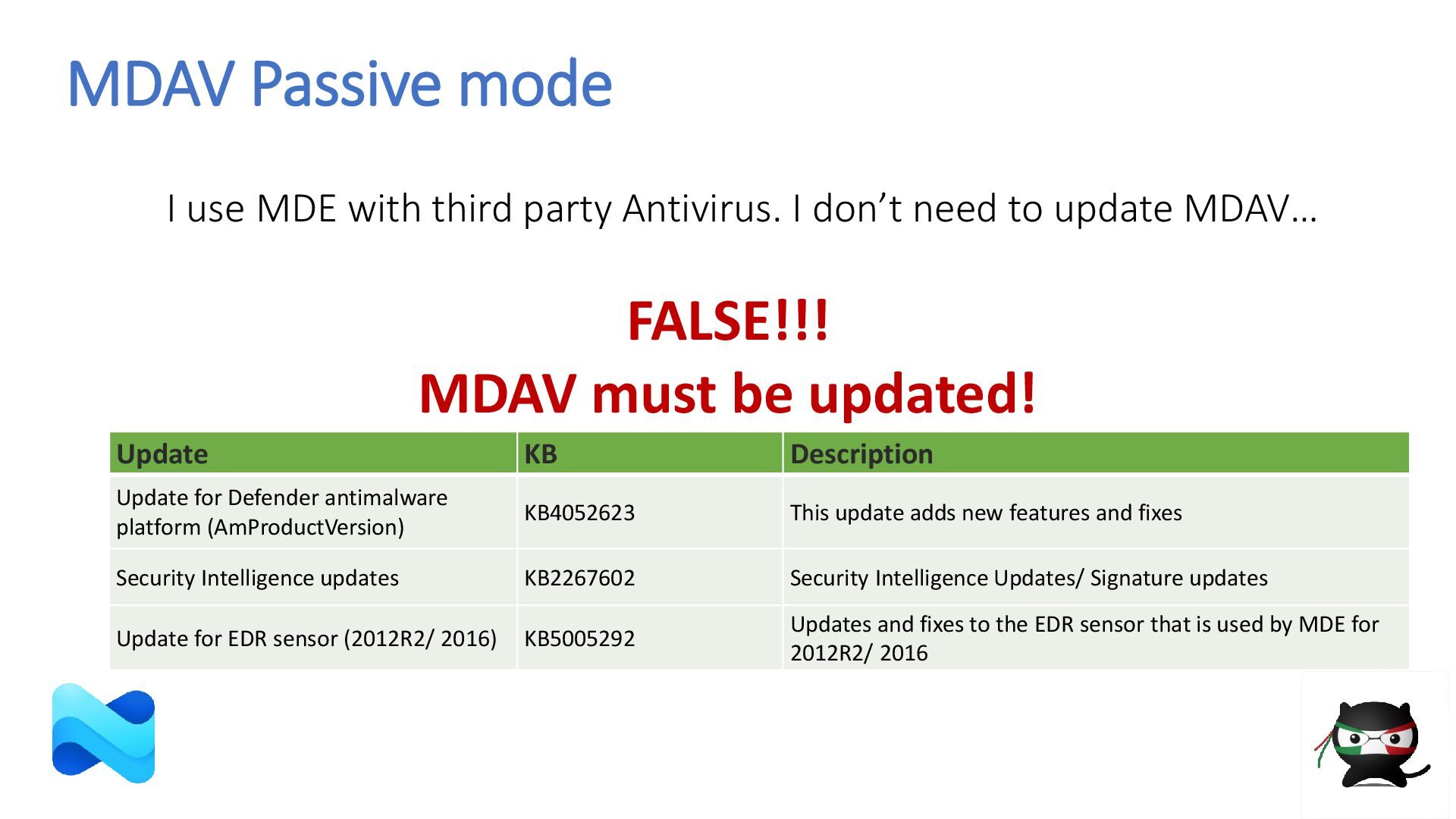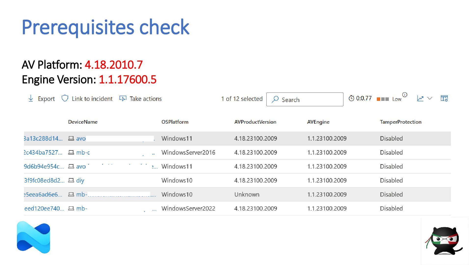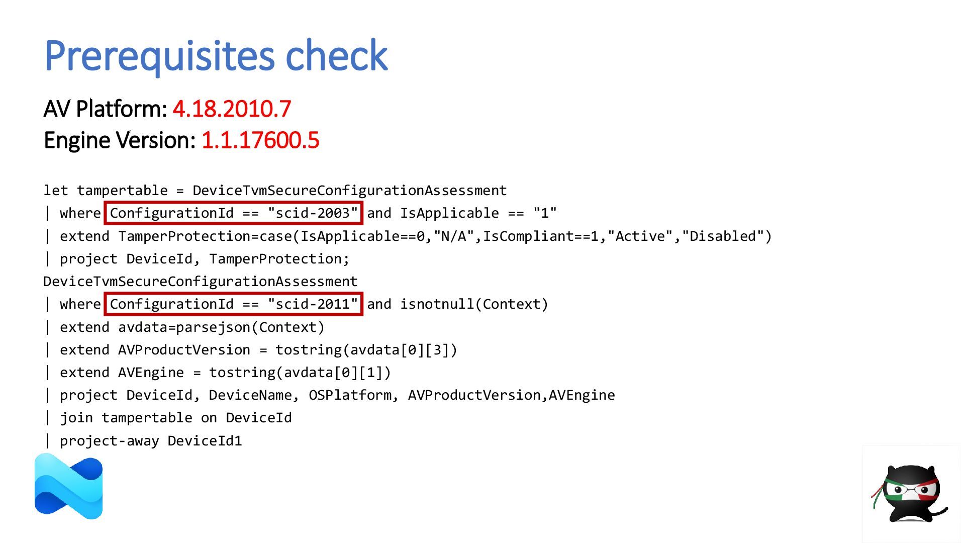 = DeviceTvmSecureConfigurationAssessment | where ConfigurationId == "scid-2003" and IsApplicable == "1" | extend TamperProtection=case(IsApplicable==0,"N/A",IsCompliant==1,"Active","Disabled") | project DeviceId, TamperProtection; DeviceTvmSecureConfigurationAssessment | where ConfigurationId == "scid-2011" and isnotnull(Context) | extend avdata=parsejson(Context) | extend AVProductVersion = tostring(avdata[0][3]) | extend AVEngine = tostring(avdata[0][1]) | project DeviceId, DeviceName, OSPlatform, AVProductVersion,AVEngine | join tampertable on DeviceId | project-away DeviceId1