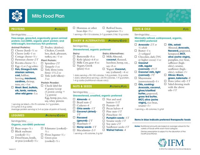 cold-pressed, organic, non-GMO preferred Avocado–2 T or ⅛ whole Butter–1 t; 2 t whipped Chocolate, dark (70% or higher cocoa)–1 oz Coconut milk, regular (canned)–1½ T Coconut milk, light (canned)–3 T Mayonnaise (unsweetened)–1 t Oils, cooking: Avocado, coconut, ghee/clarified butter, grapeseed, grass fed butter, MCT, olive (extra virgin), rice bran, sesame–1 t Oils, salad: Almond, Avocado, flaxseed, grapeseed, hempseed, MCT, olive (extra virgin), pumpkin, rice bran, safflower (high- oleic), sesame, sunflower (high- oleic), walnut–1 t Olives: Black, green, kalamata–8 Pesto (olive oil)–1 T Salad dressing made with the above oils–1 T 1 serving = 45 calories, 5 g fat PROTEINS Proteins Servings/day______ Free-range, grass-fed, organically grown animal protein; non-GMO, organic plant protein; and wild-caught, low-mercury fish preferred. Animal Proteins: Cheese (hard)–½ oz Cheese (soft)–1 oz Cottage cheese–¼ c Parmesan cheese–2 T Ricotta cheese–¼ c Egg–1; or 2 egg whites Fish, Omega-3 rich: Alaskan salmon, cod, halibut, herring, mackerel, sardines, shrimp, tuna, etc.–1 oz Meat: Beef, buffalo, elk, lamb, venison, other wild game–1 oz Poultry (skinless): Chicken, Cornish hen, duck, pheasant, turkey, etc.–1 oz Plant Protein: Spirulina–2 T Tempeh–1 oz Tofu (firm/extra firm)–1½-2 oz Tofu (soft/silken)– 3 oz Protein Powder: Check label for # grams/scoop (1 protein serving = 7 g protein) Egg, hemp, pea, rice, soy, whey protein LEGUMES Proteins/Carbs Servings/day______ Organic, non-GMO preferred Bean soups–¾ c Black soybeans (cooked)–½ c Dried beans, lentils, or peas (cooked)–½ c Edamame (cooked)– ½ c Flour, legume–¼ c Green peas (cooked)–½ c DAIRY & ALTERNATIVES Proteins/Carb Servings/day______ Unsweetened, organic preferred Dairy: Buttermilk–8 oz Kefir (plain)–6-8 oz Milk: Cow, goat–8 oz Yogurt, Greek (plain)–6 oz Dairy Alternatives: Milk: Almond, coconut, flaxseed, hazelnut, hemp, oat, , soy–8 oz Yogurt: Coconut, soy (cultured) –6 oz 1 dairy serving = 90–150 calories, 7–8 g protein, 12 g carbs 1 dairy alternative serving = 25–90 calories, 1–9 g protein, 1–4 g carbs (nutritional values vary) 1 serving = 90–110 calories, 3–7 g protein, 0 fat, 15 g carbs Hummus or other bean dips–⅓ c Refried beans, vegetarian–½ c NUTS & SEEDS Proteins/Fats Servings/day______ Unsweetened, unsalted, organic preferred Almonds–6 Brazil nuts–2 Cashews–6 Chia seeds–1 T Coconut (dried)– 3 T Flaxseed (ground)–2 T Hazelnuts–5 Hemp seeds–1 T Macadamias–2-3 Nut and seed butters–½ T Peanuts–10 Pecan halves–4 Pine nuts–1 T Pistachios–16 Pumpkin seeds–1 T Sesame seeds–1 T Soy nuts–2 T Sunflower seeds–1 T Walnut halves–4 1 serving = 45 calories, 5 g fat Version 5 1 serving as listed = 35–75 calories, 5–7 g protein, 3–5 g fat, 0–4 g carbs Average protein serving is 3–4 oz (size of palm of hand). Items in blue indicate preferred therapeutic foods © 2016 The Institute for Functional Medicine Notes: Nutritional amounts are based on average values for the variety of foods within each food category. Dietary prescription is subject to the discretion of the health practitioner.