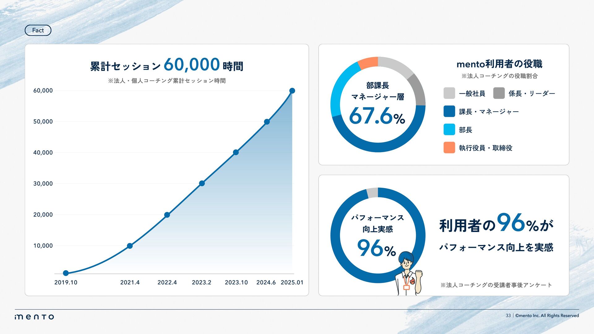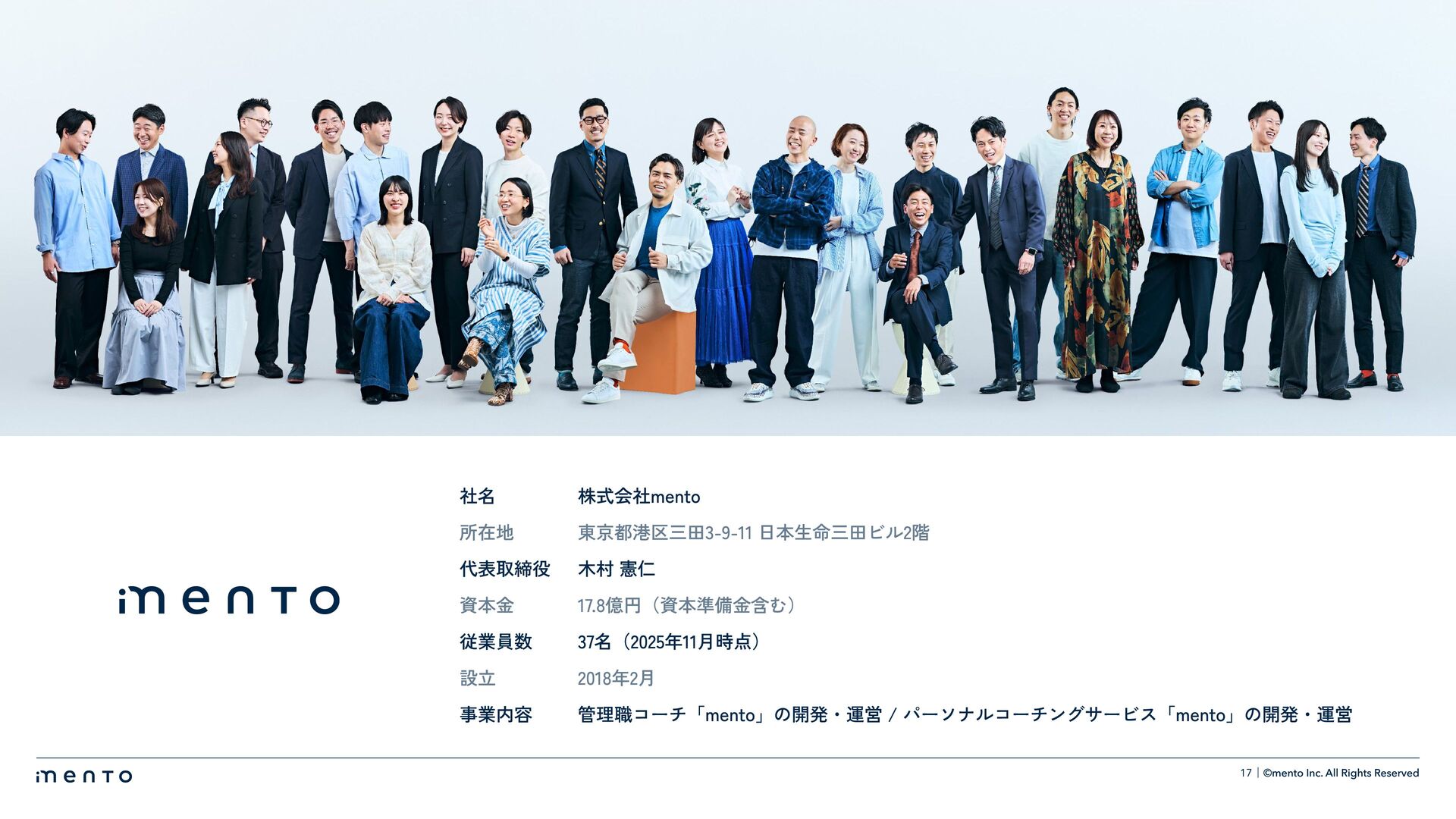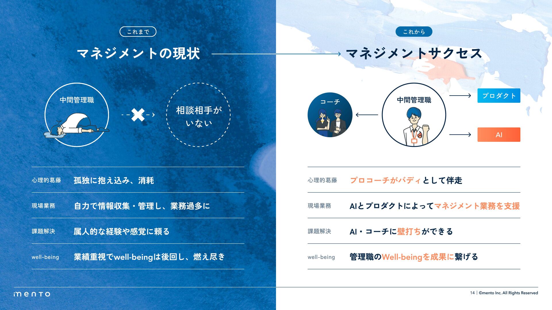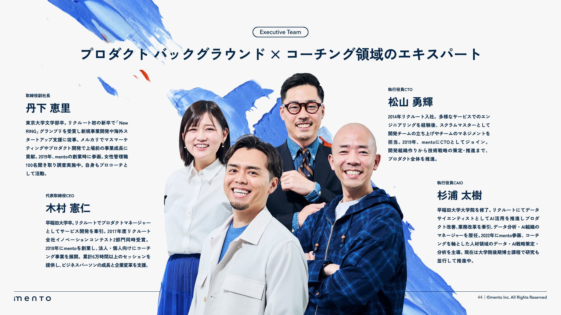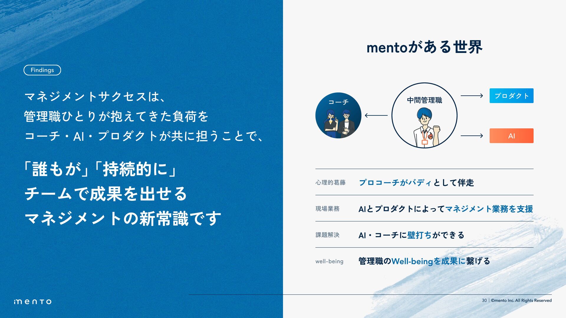 株式会社mentoは「夢中をふつうにする」をビジョンに、管理職コーチ「mento」を提供しています。 シリーズB 16億の資金調達を経て、今後はさらにAI×プロフェッショナルコーチで中間管理職を支えるプロダクトをリリース予定です。