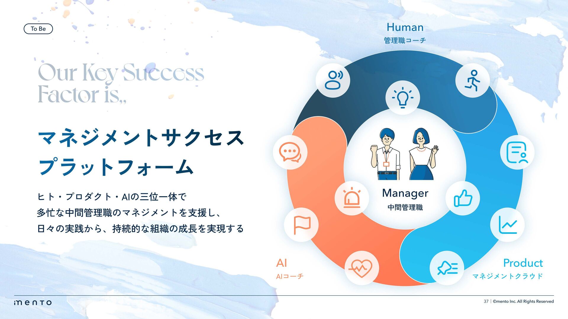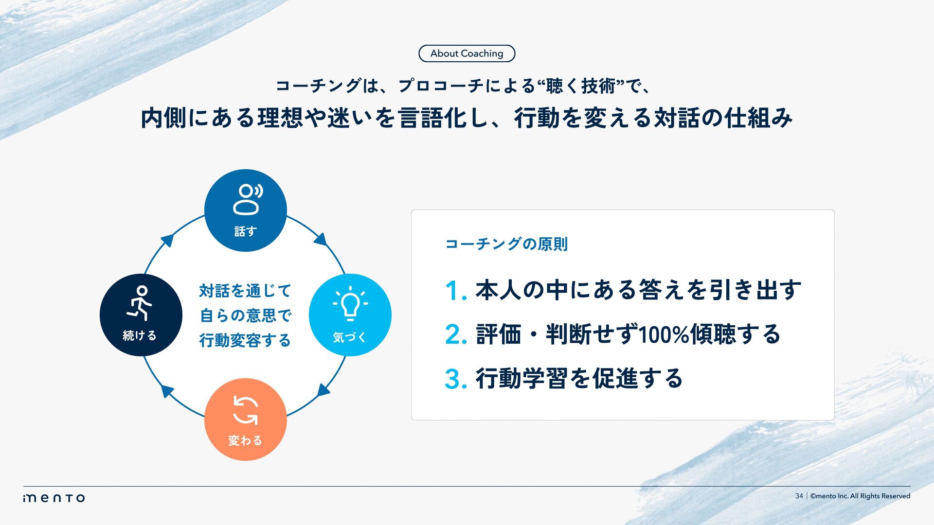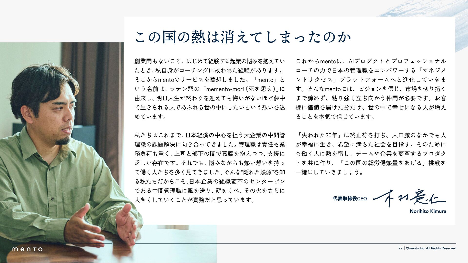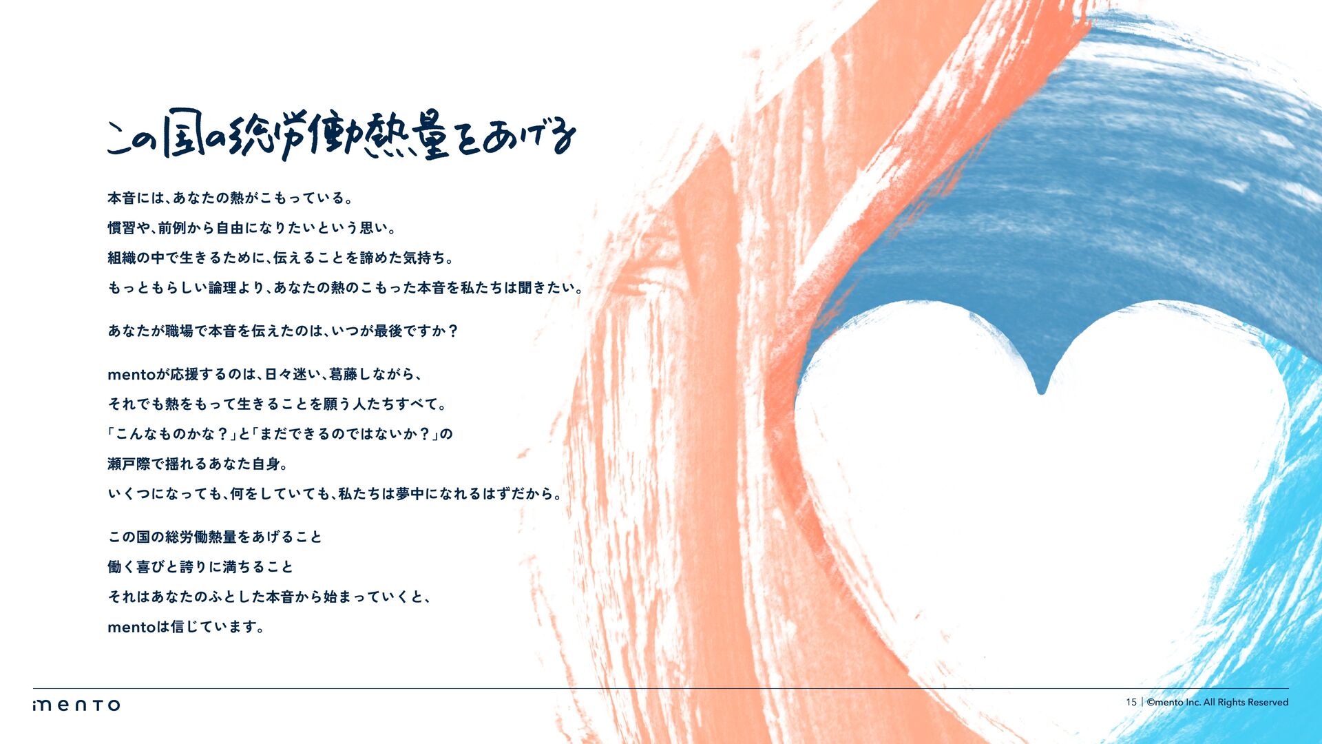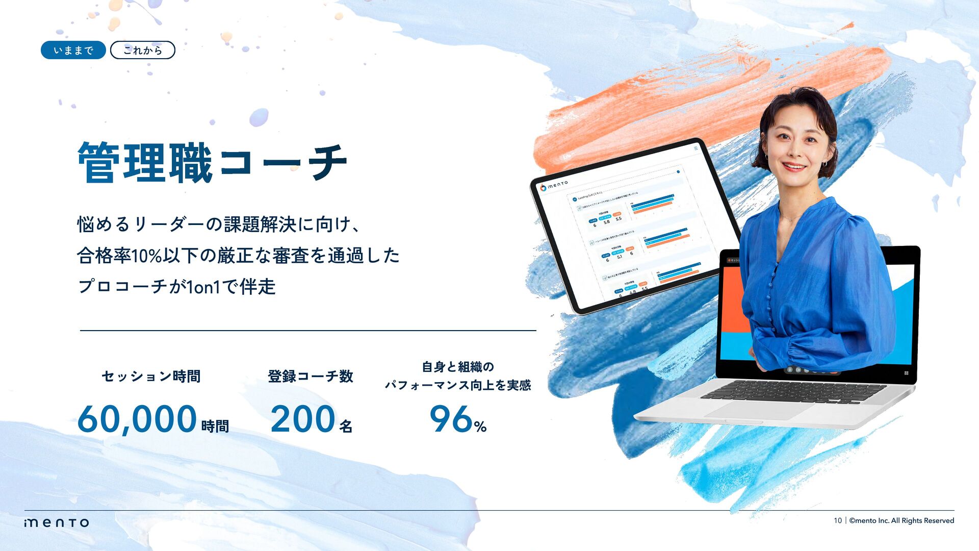 株式会社mentoは「夢中をふつうにする」をビジョンに、管理職コーチ「mento」を提供しています。 シリーズB 16億の資金調達を経て、今後はさらにAI×プロフェッショナルコーチで中間管理職を支えるプロダクトをリリース予定です。