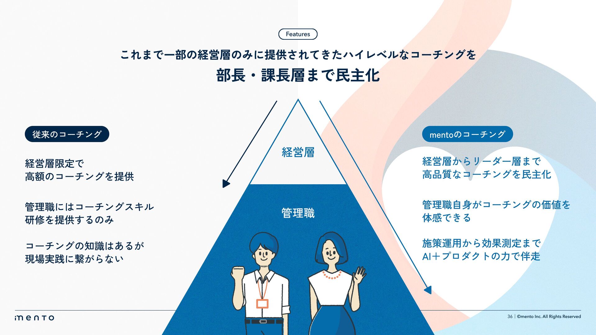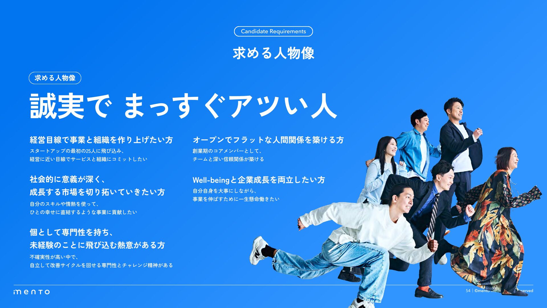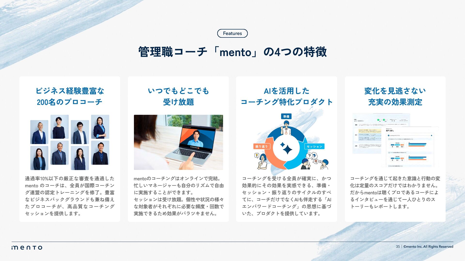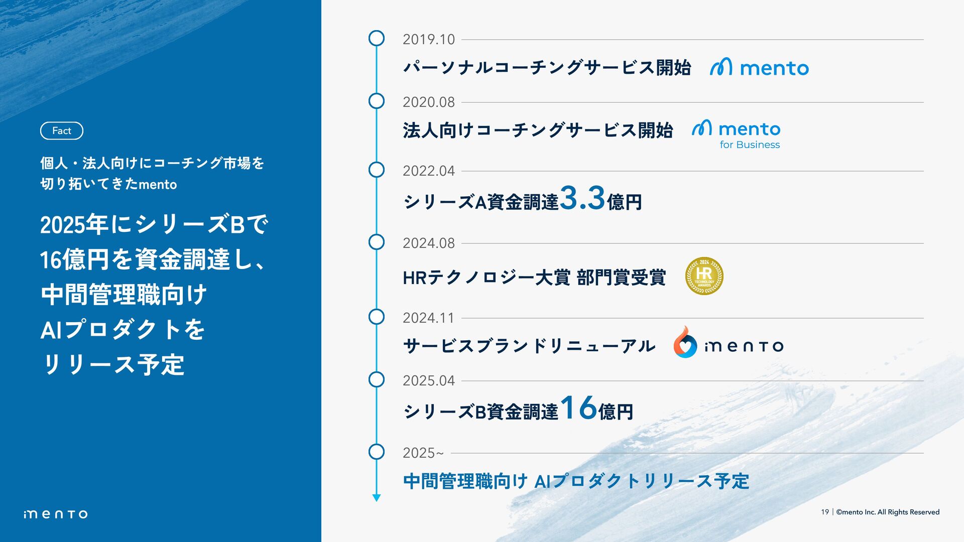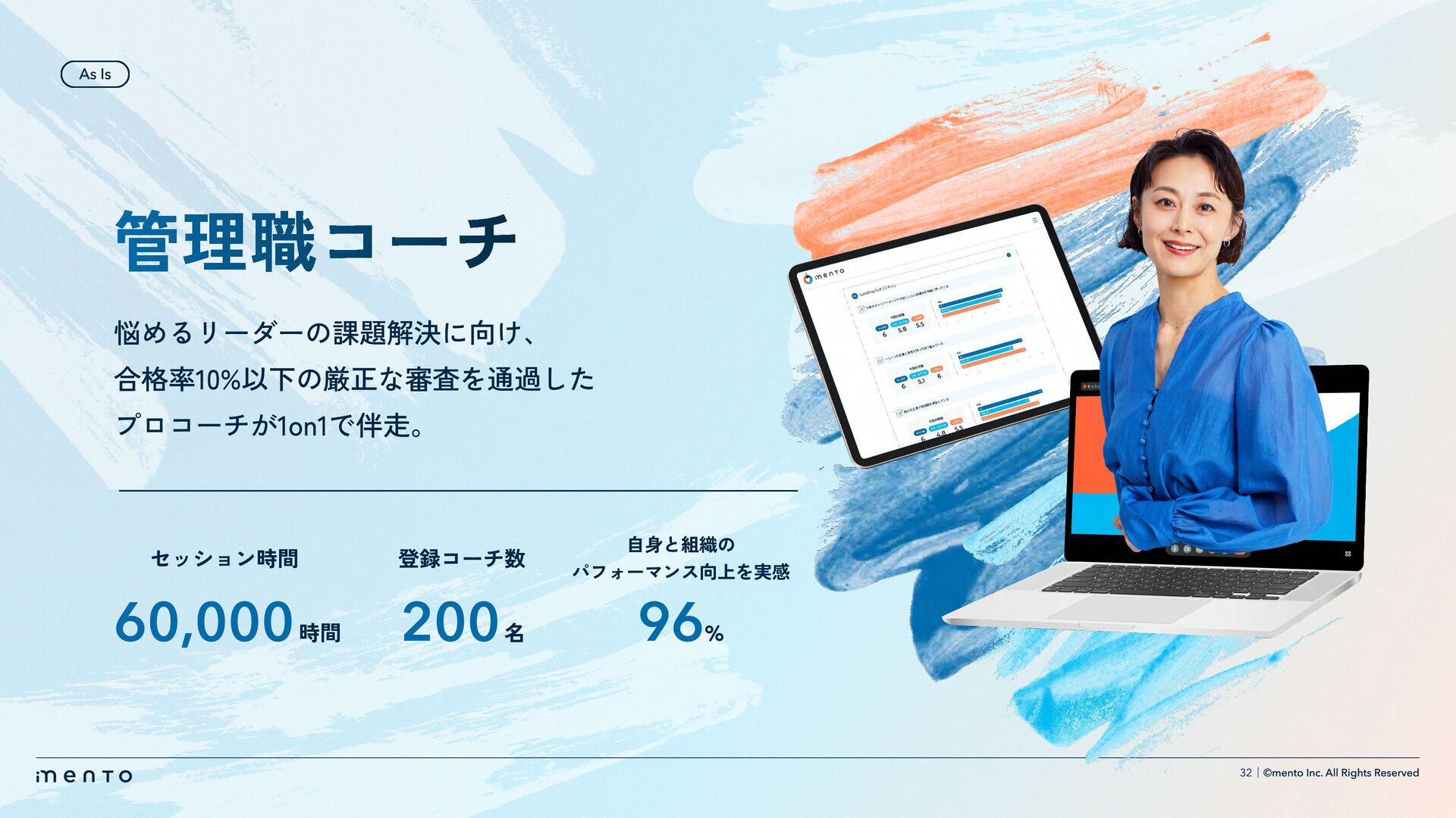 株式会社mentoは「夢中をふつうにする」をビジョンに、管理職コーチ「mento」を提供しています。 シリーズB 16億の資金調達を経て、今後はさらにAI×プロフェッショナルコーチで中間管理職を支えるプロダクトをリリース予定です。
