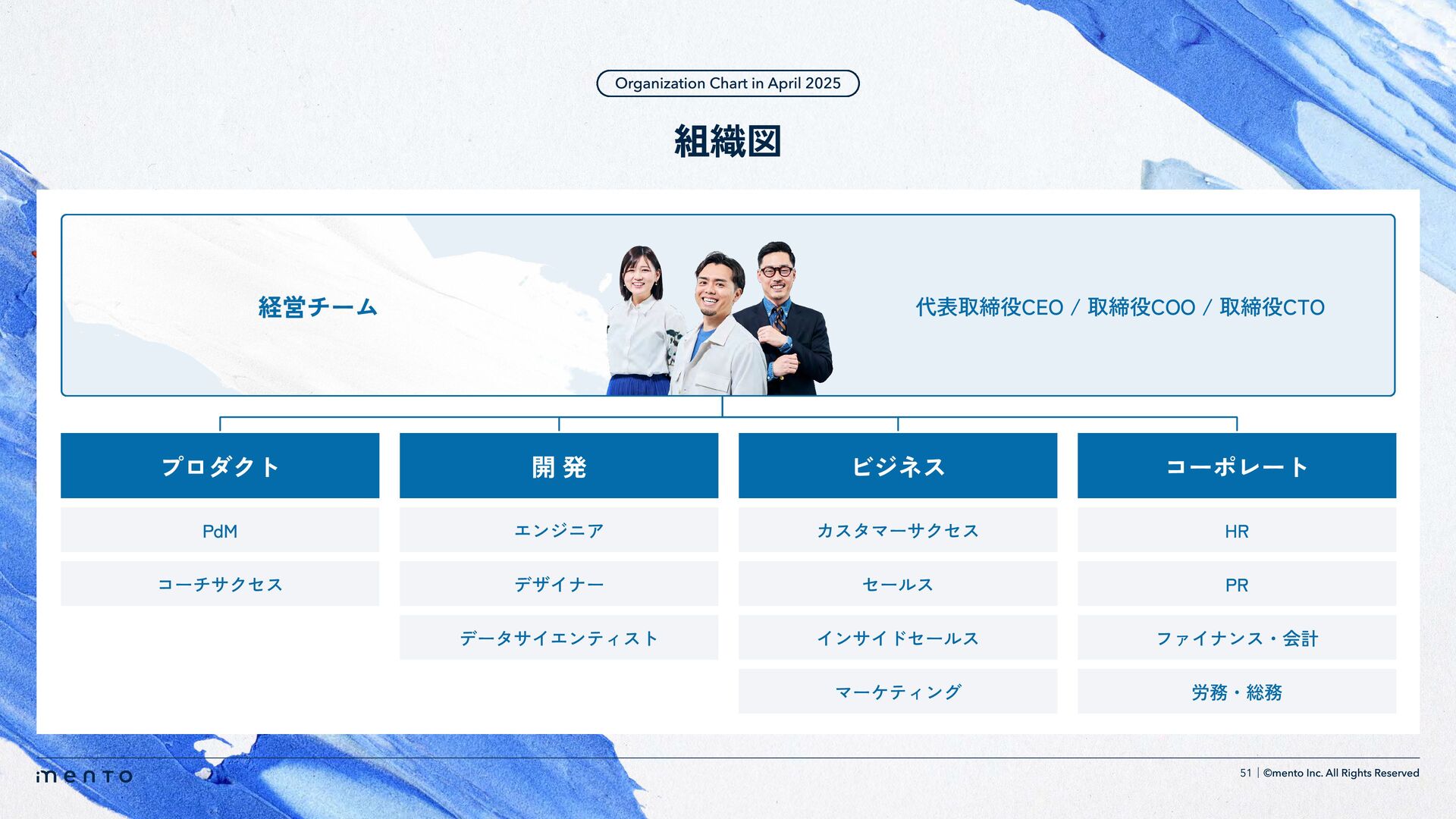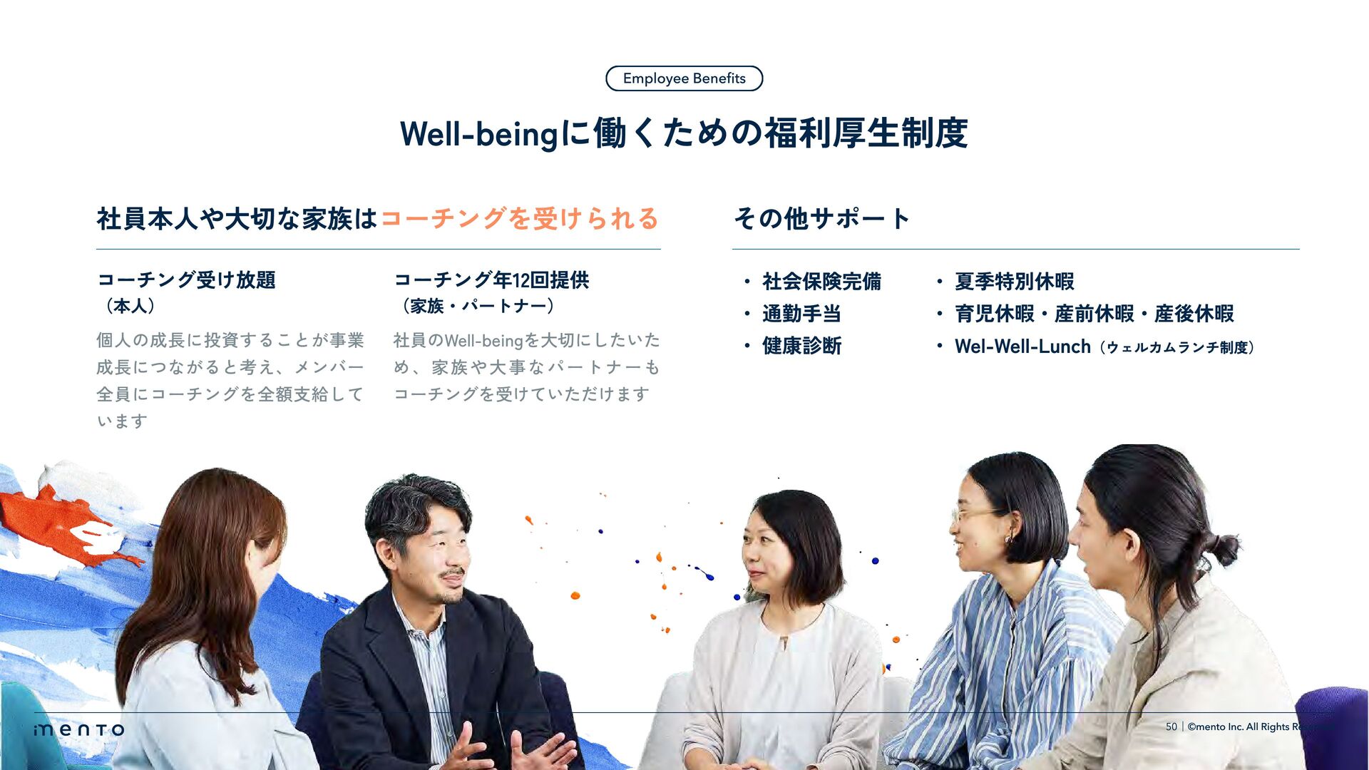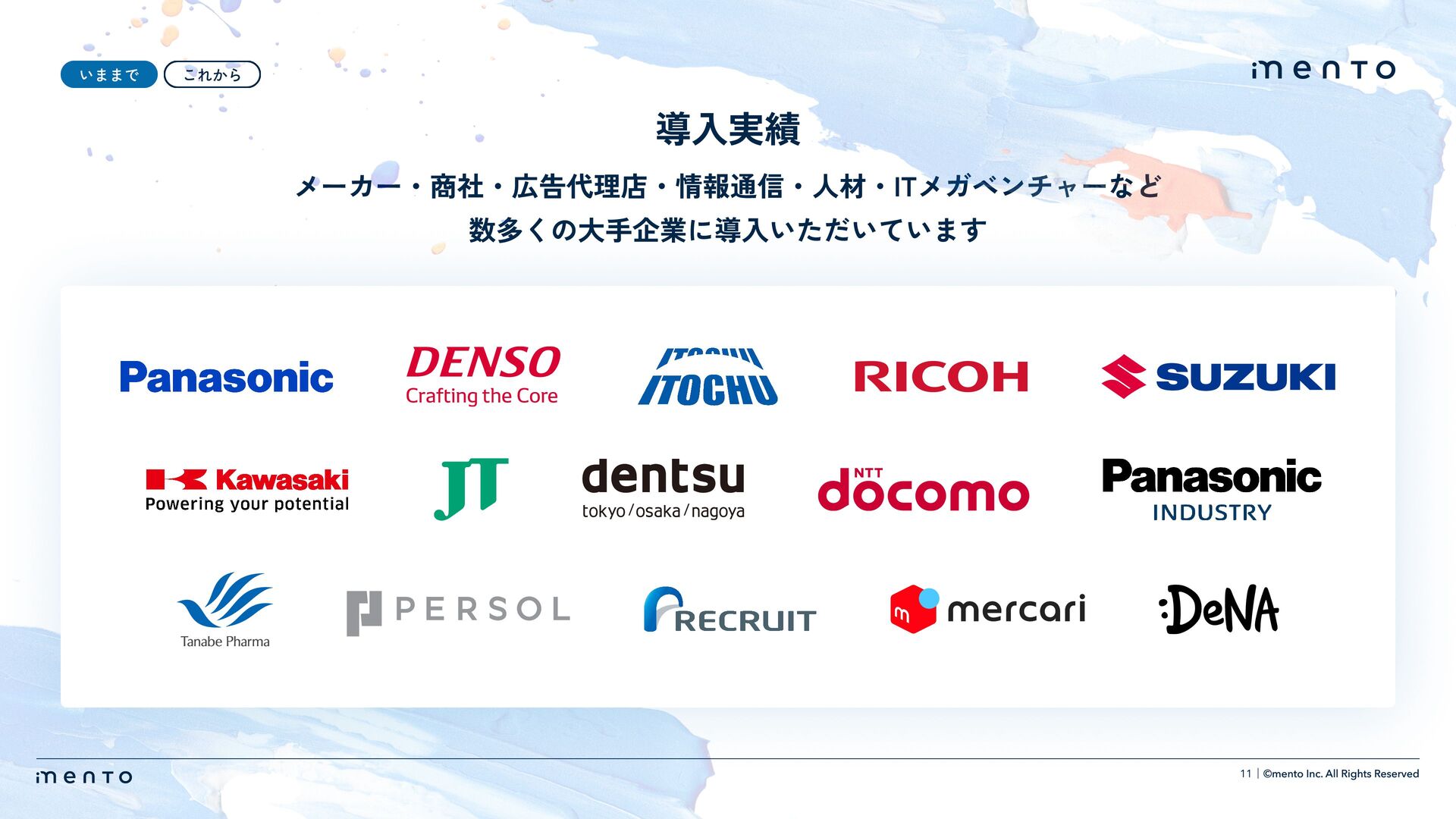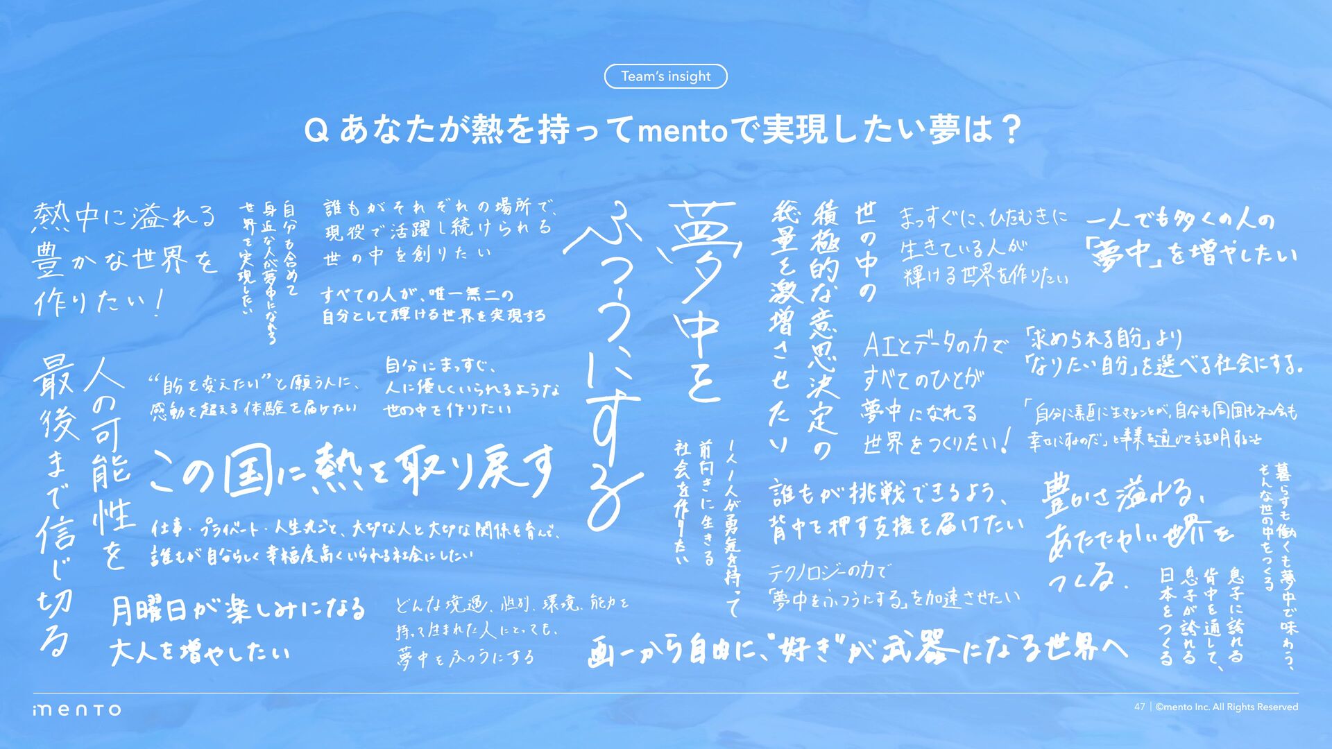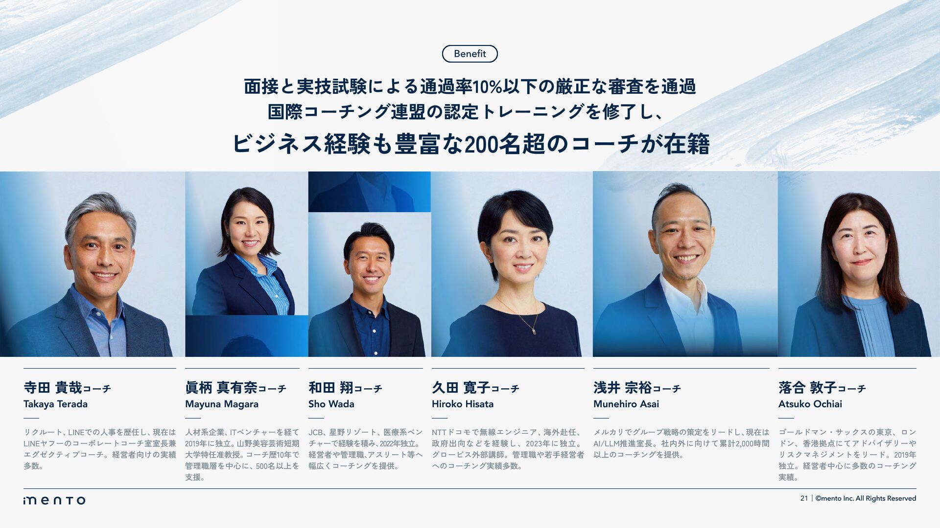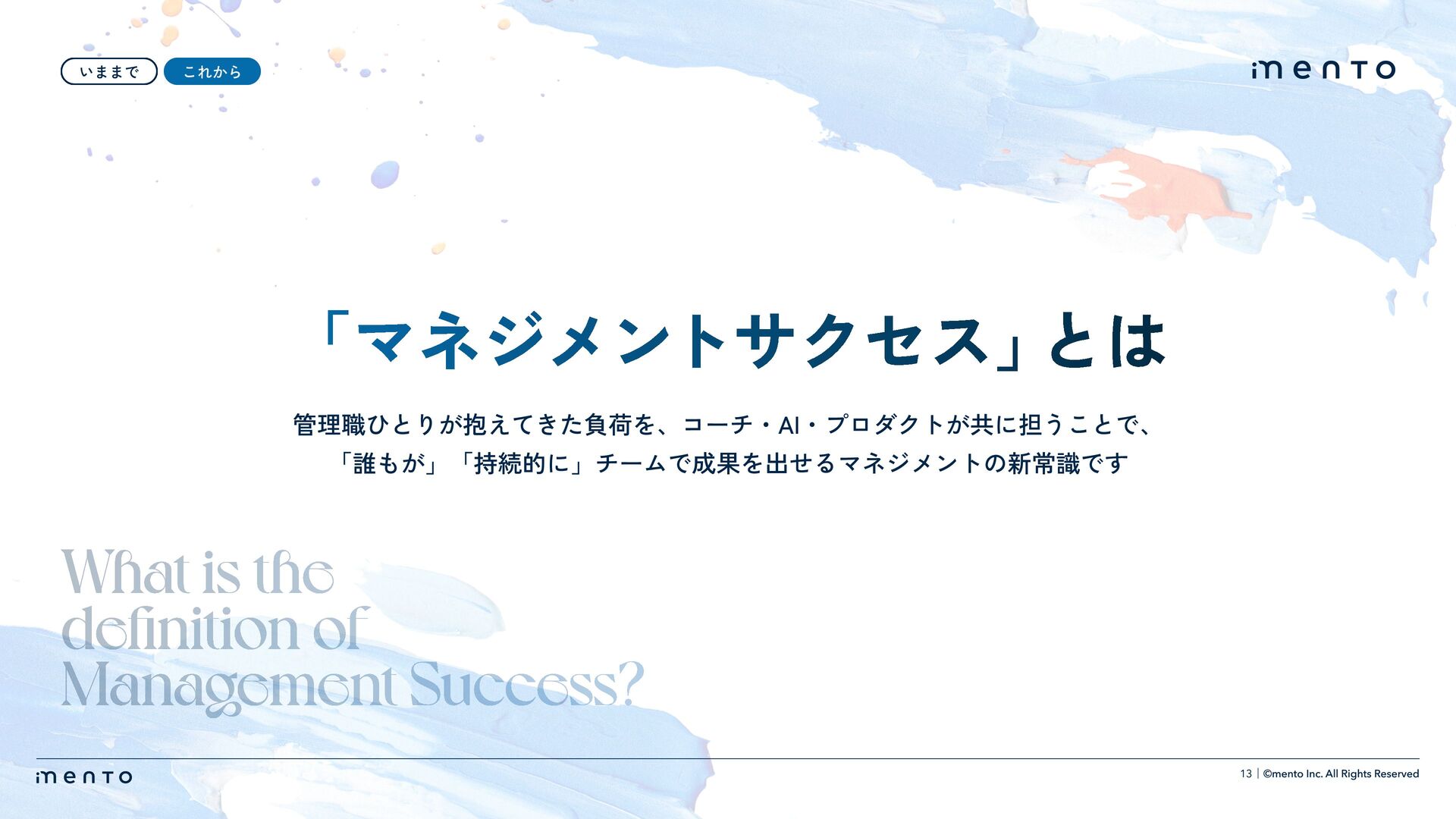 株式会社mentoは「夢中をふつうにする」をビジョンに、管理職コーチ「mento」を提供しています。 シリーズB 16億の資金調達を経て、今後はさらにAI×プロフェッショナルコーチで中間管理職を支えるプロダクトをリリース予定です。