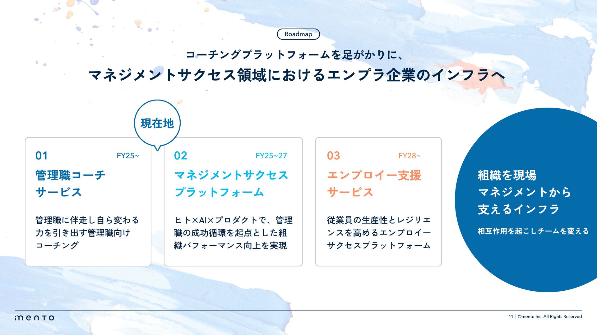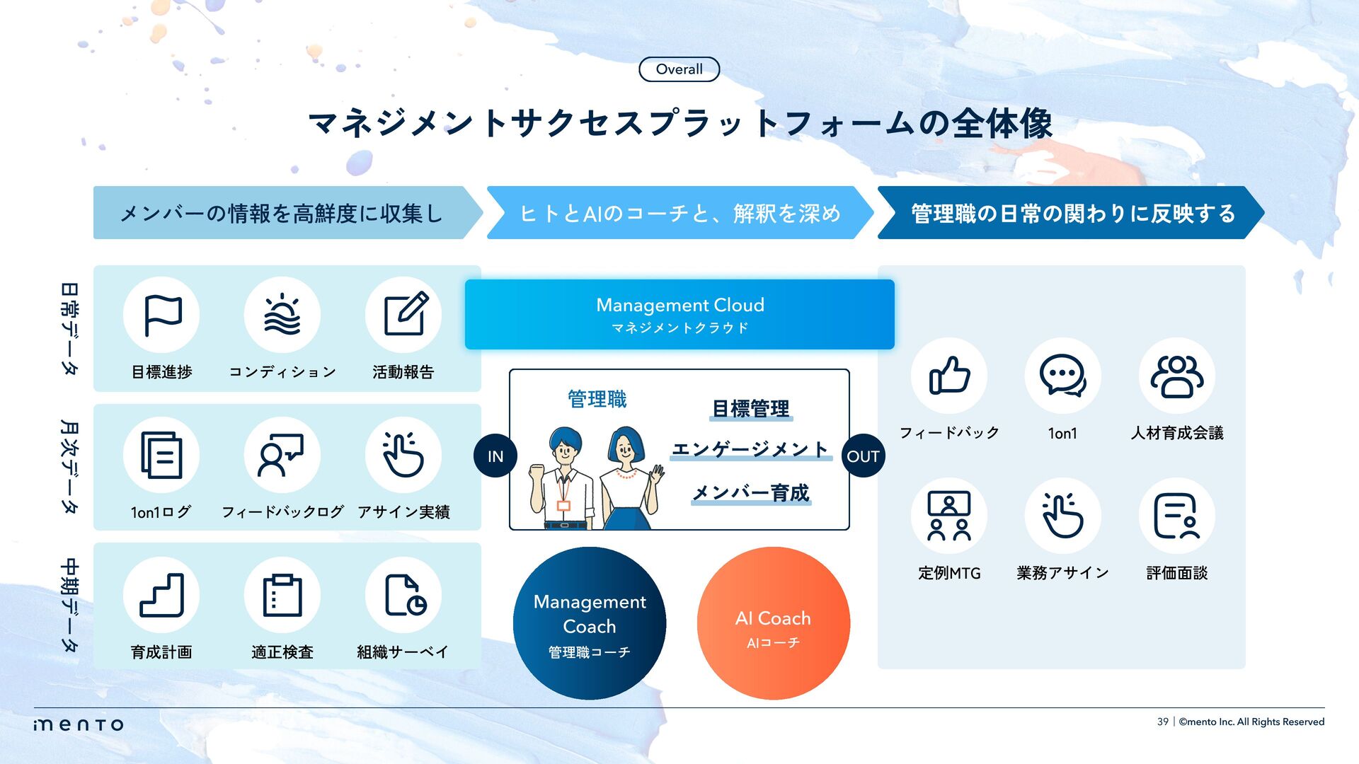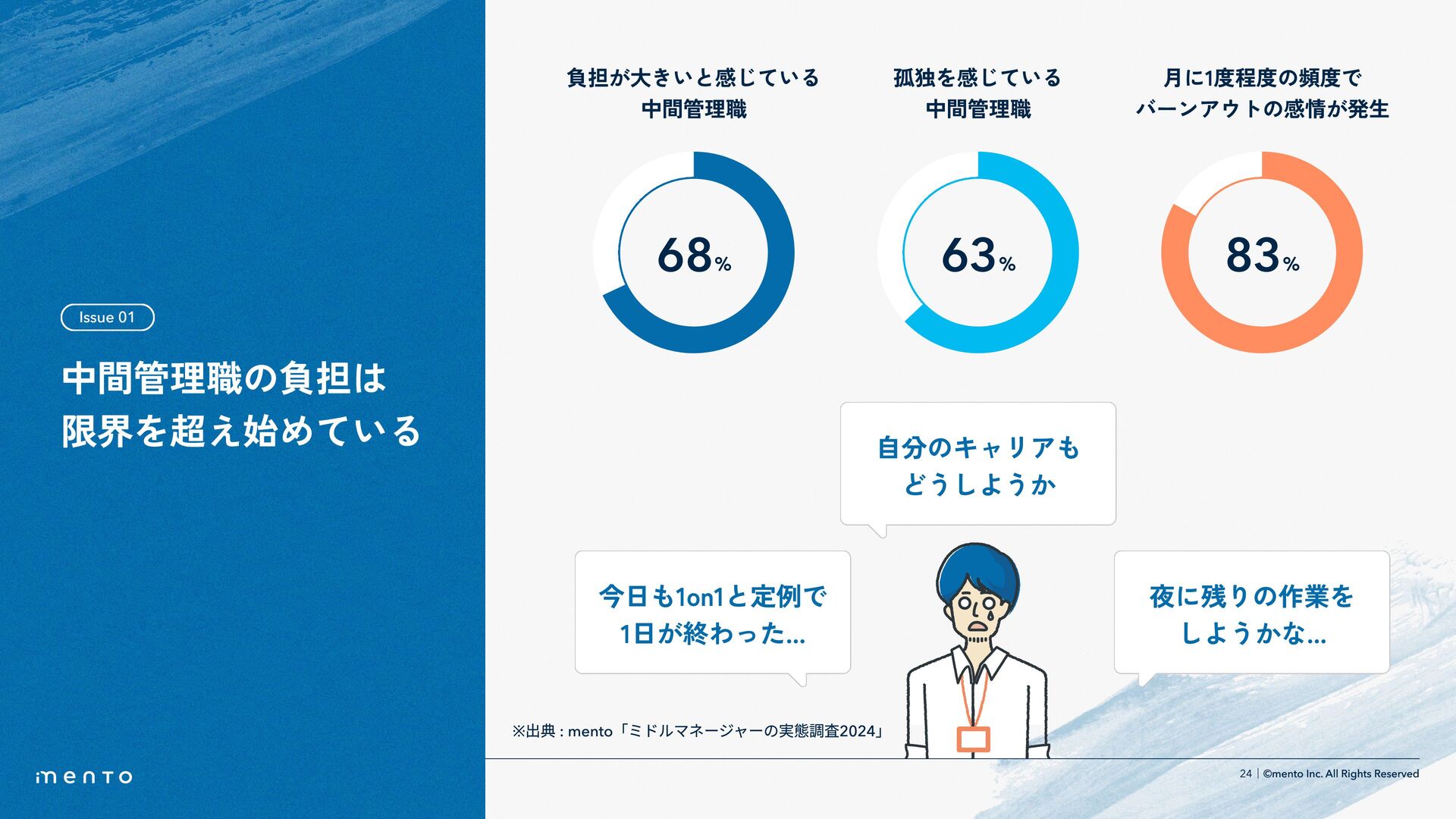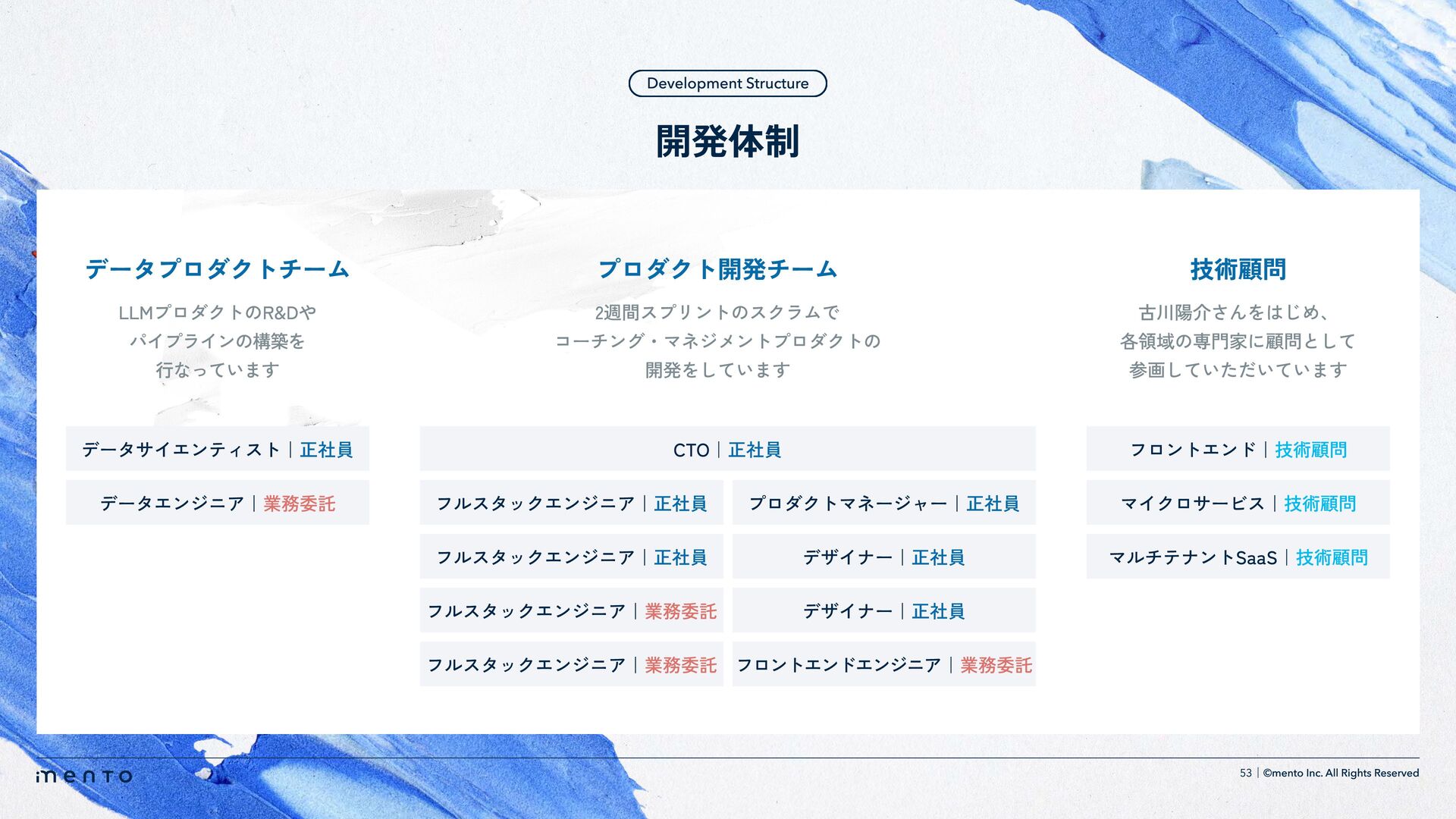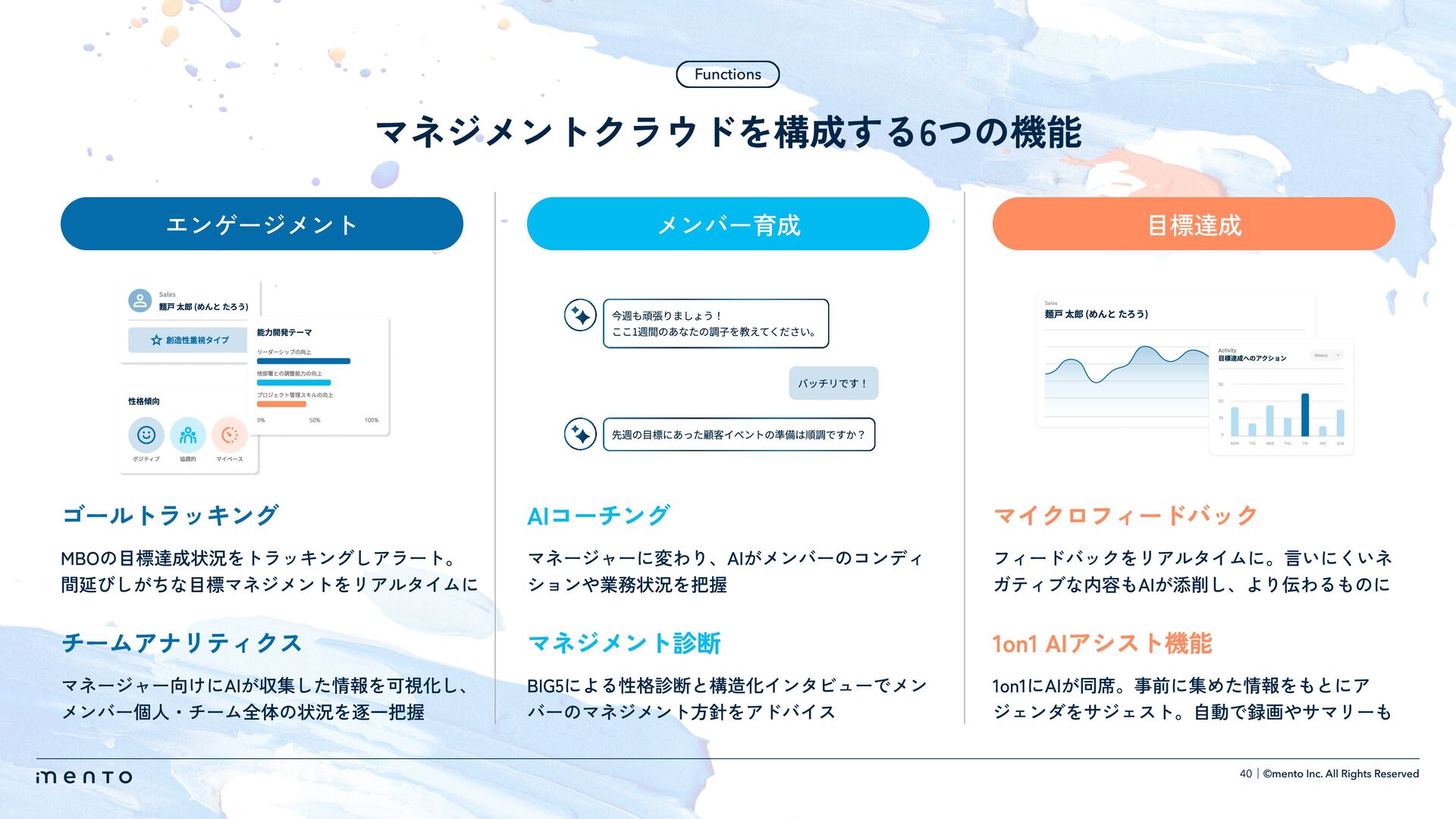 株式会社mentoは「夢中をふつうにする」をビジョンに、管理職コーチ「mento」を提供しています。 シリーズB 16億の資金調達を経て、今後はさらにAI×プロフェッショナルコーチで中間管理職を支えるプロダクトをリリース予定です。
