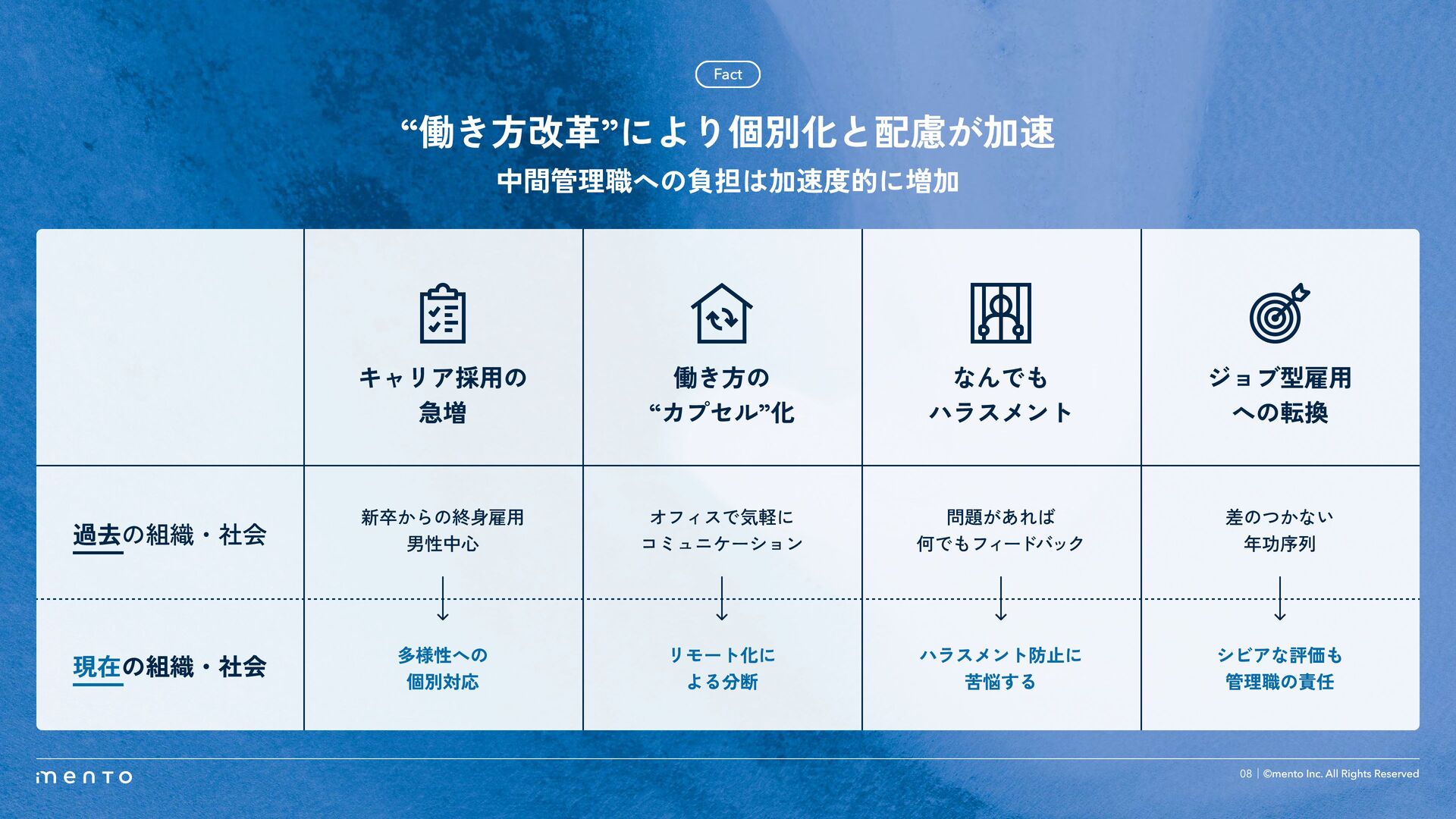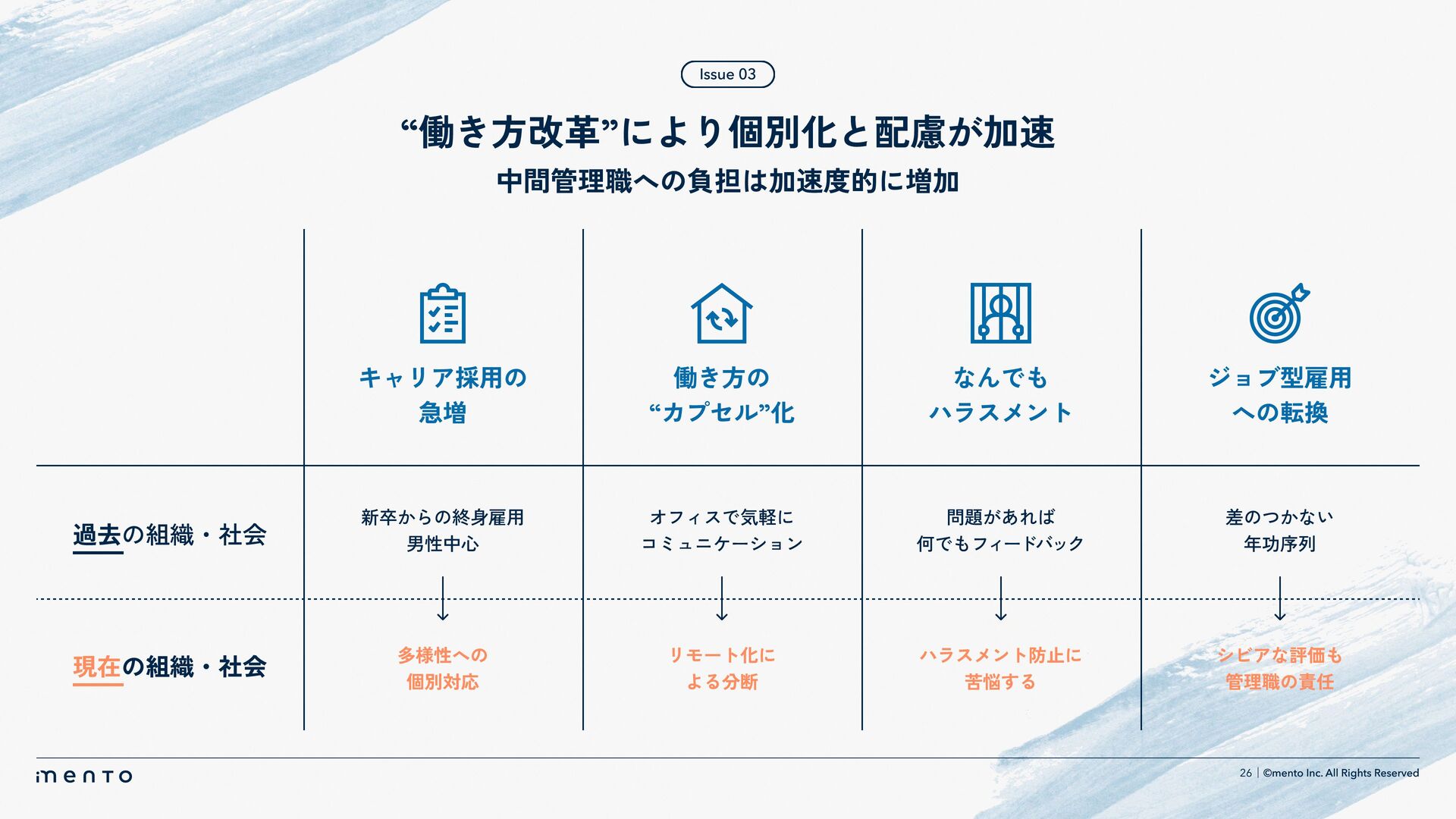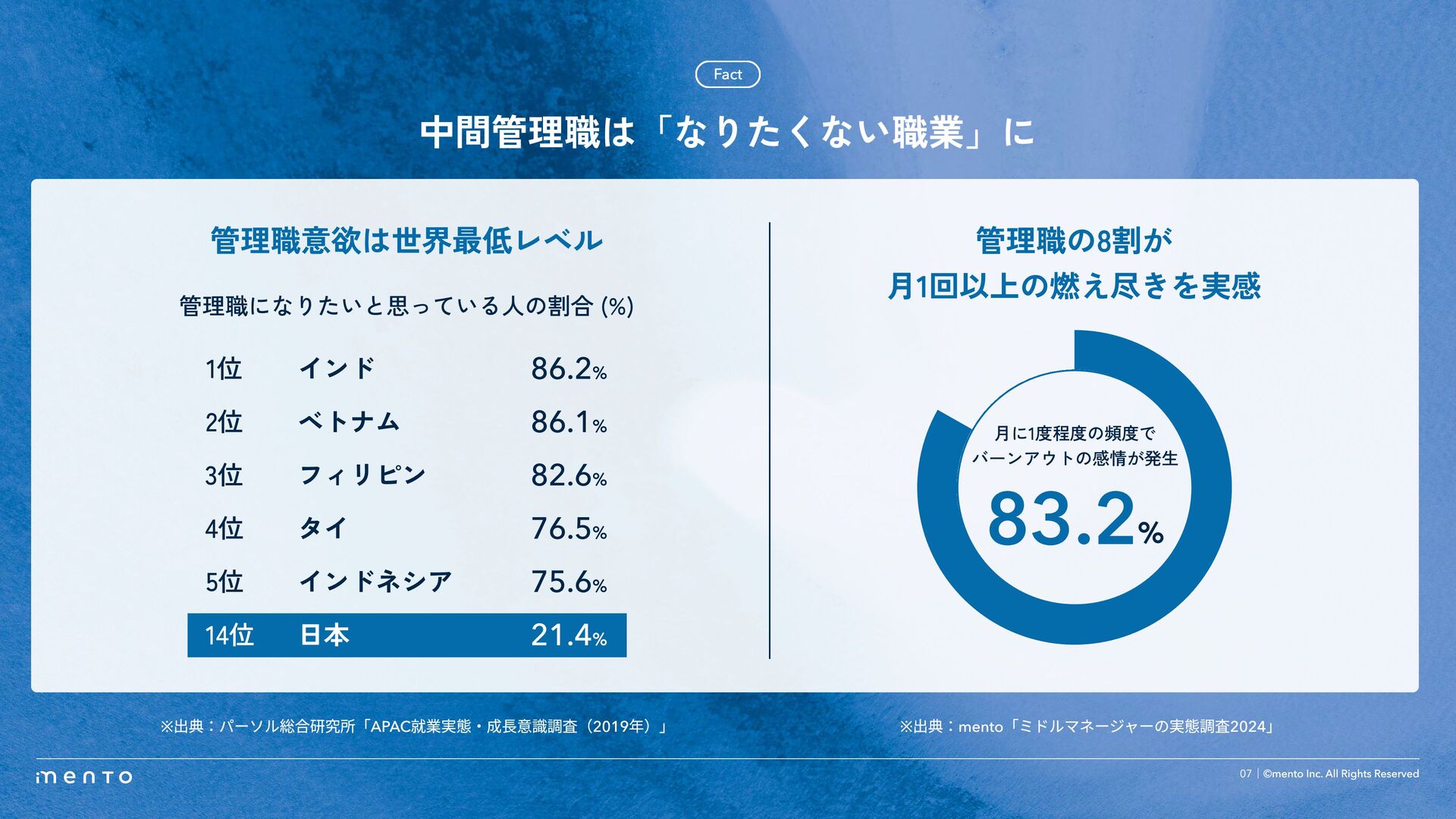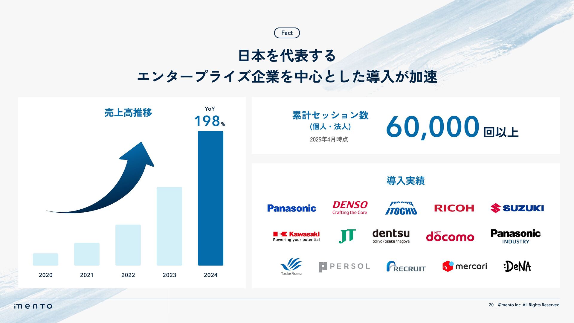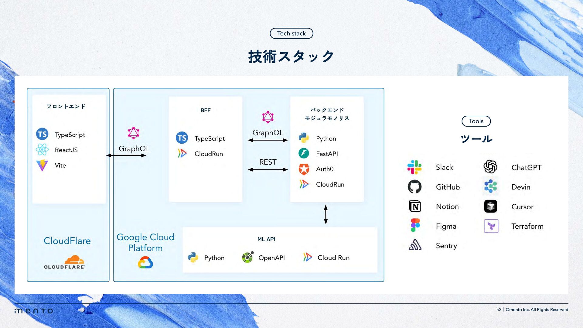 株式会社mentoは「夢中をふつうにする」をビジョンに、管理職コーチ「mento」を提供しています。 シリーズB 16億の資金調達を経て、今後はさらにAI×プロフェッショナルコーチで中間管理職を支えるプロダクトをリリース予定です。