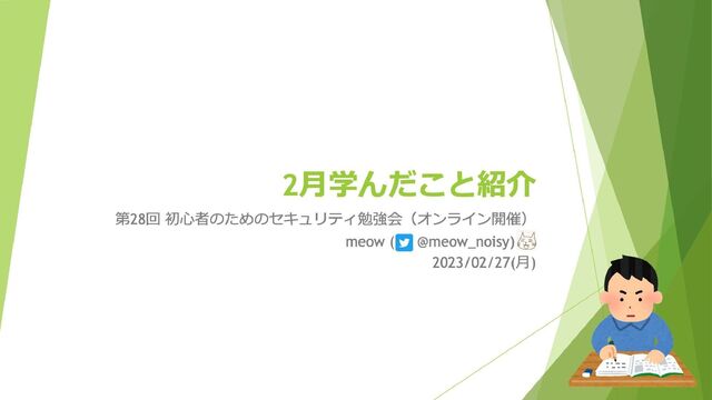 2023/02/27(月) に 28回 初心者のためのセキュリティ勉強会(オンライン開催) で発表したスライドです。 https://sfb.connpass.com/event/274171/