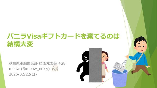 バニラVisaギフトカードを棄てるのは 結構⼤変 秋葉原電脳倶楽部 技術発表会 #28 meow (@meow_noisy) _ 2026/02/22(⽇)