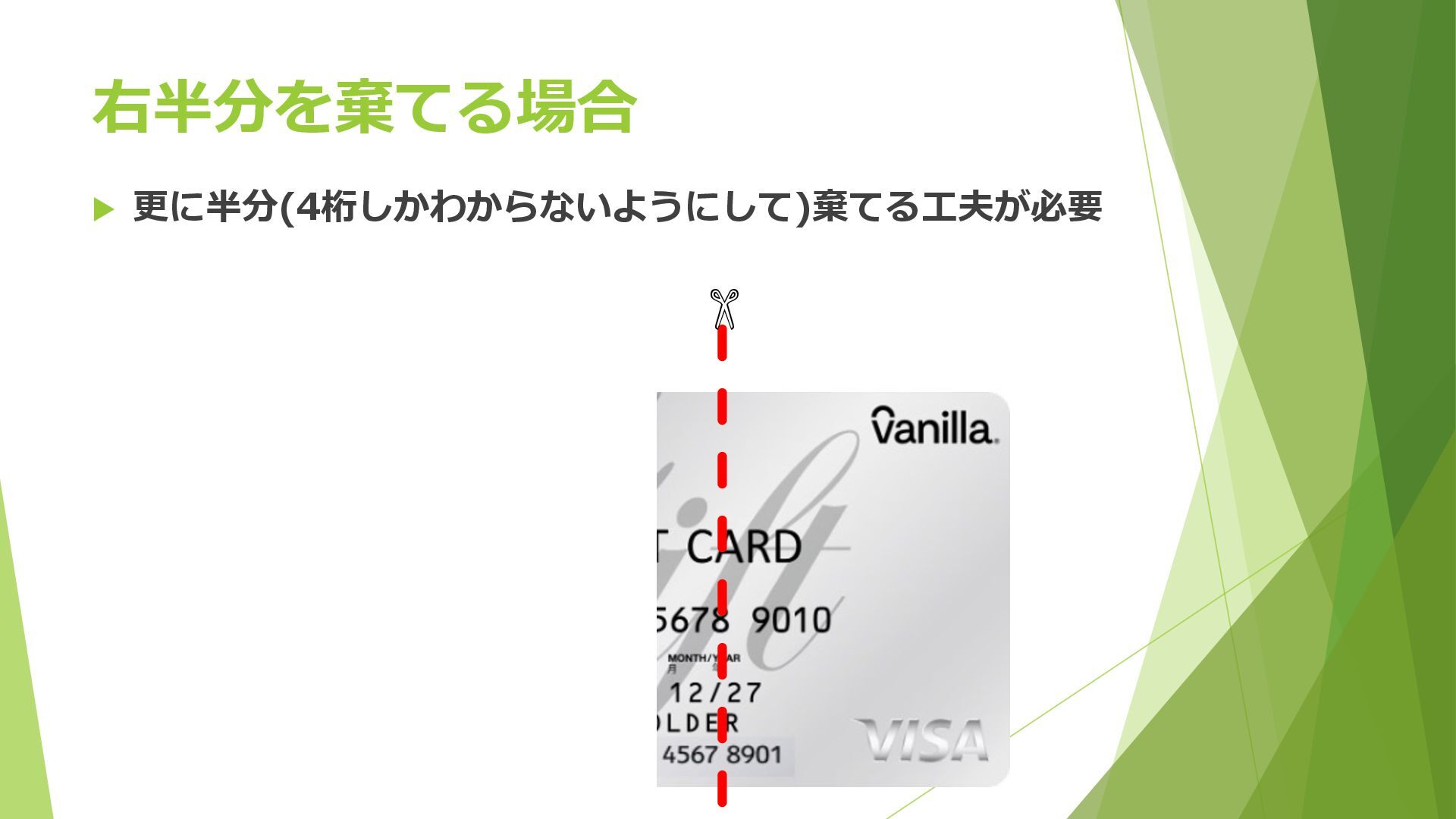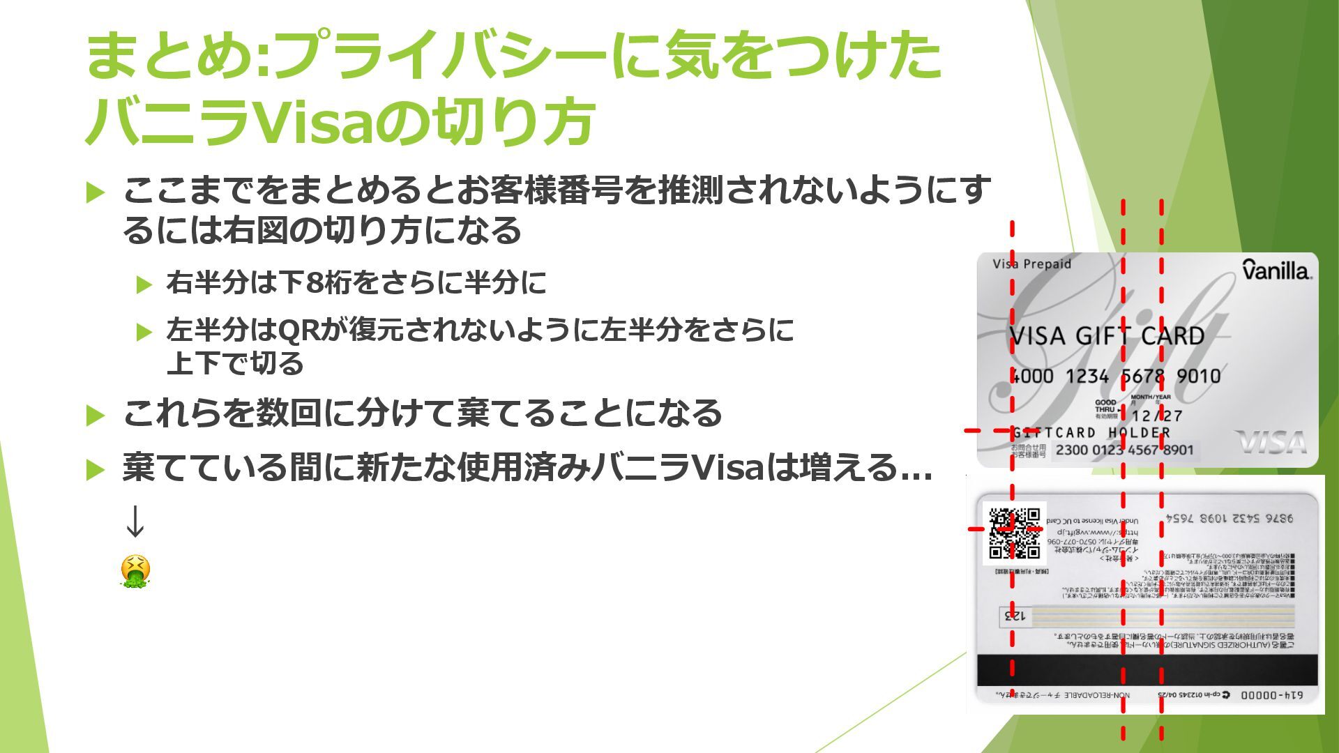 まとめ:プライバシーに気をつけた バニラVisaの切り⽅ u ここまでをまとめるとお客様番号を推測されないようにす るには右図の切り⽅になる u 右半分は下8桁をさらに半分に u 左半分はQRが復元されないように左半分をさらに 上下で切る