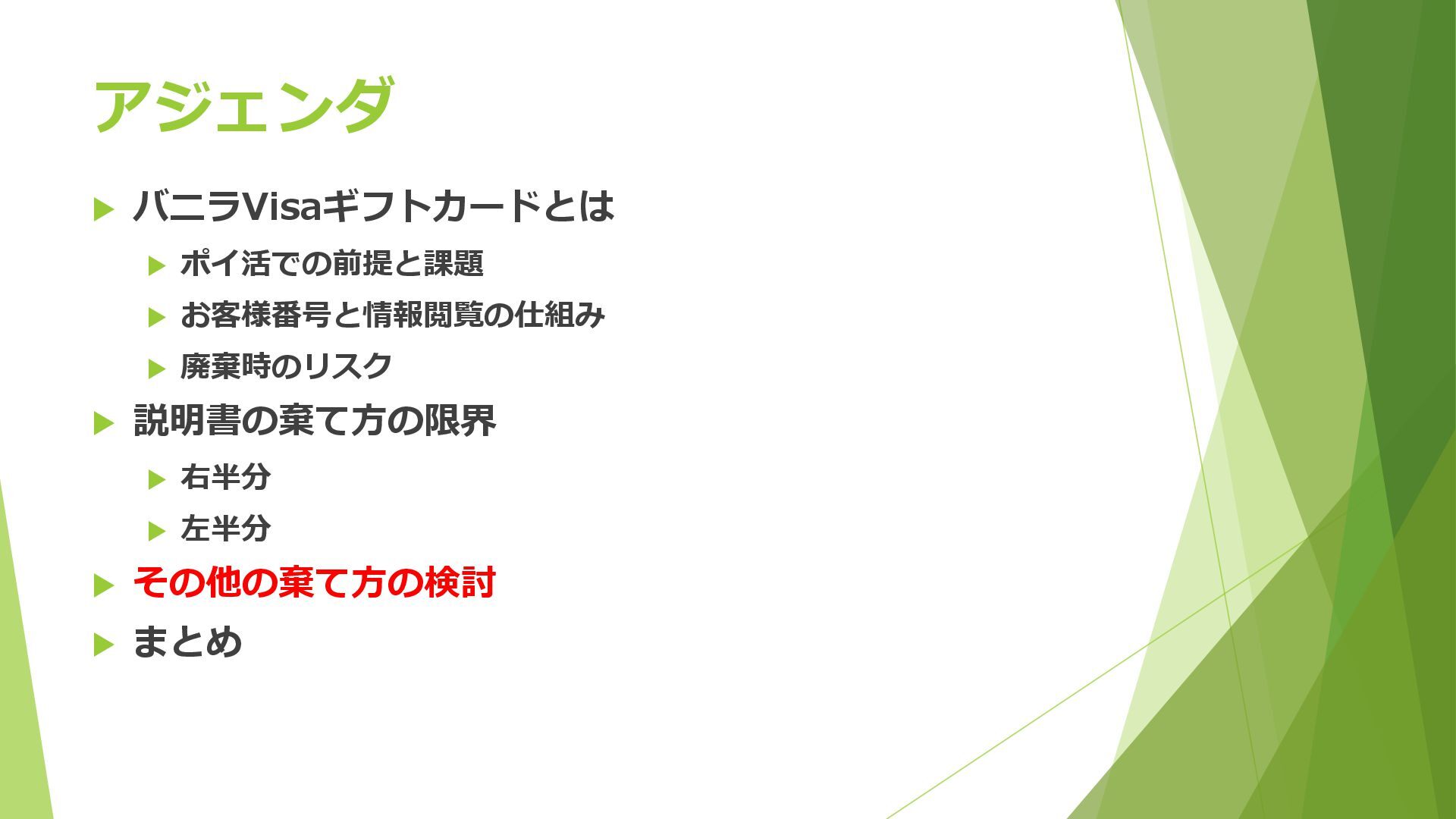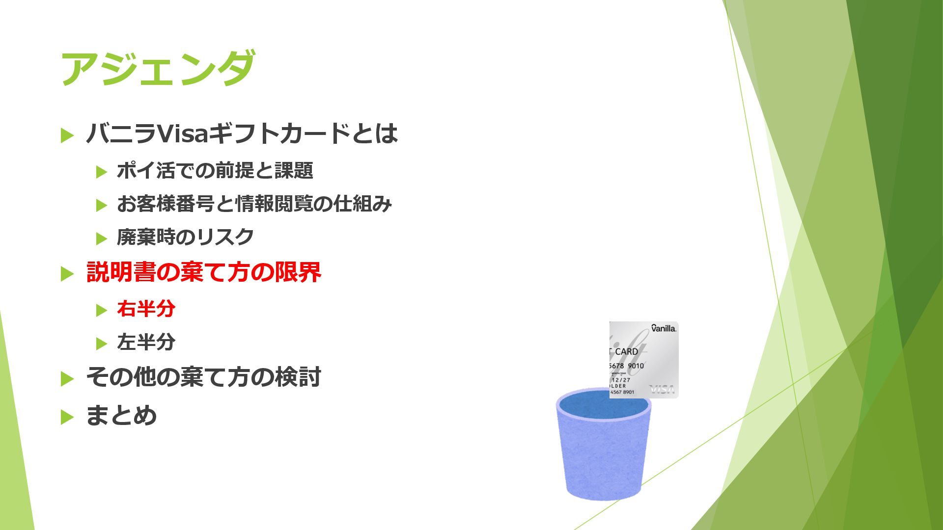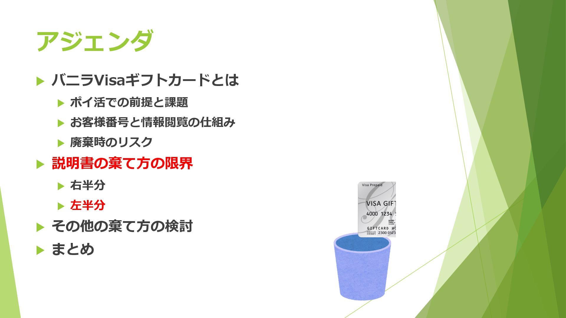 発表概要 u ポイ活界隈で⼈気のプリペイドカード『バニラVisaギフト カード』の廃棄時に⽣じるプライバシーリスクを説明する u 典型的な棄て⽅の弱点を⽰し、現実的な対処の負荷が⾼い ことを共有する ⚠免責事項 本発表はプライバシー保護の勉強を⽬的として作成されました。 本発表の内容を不正に利⽤した場合、刑事罰、⺠事訴訟の対象となることがあります。