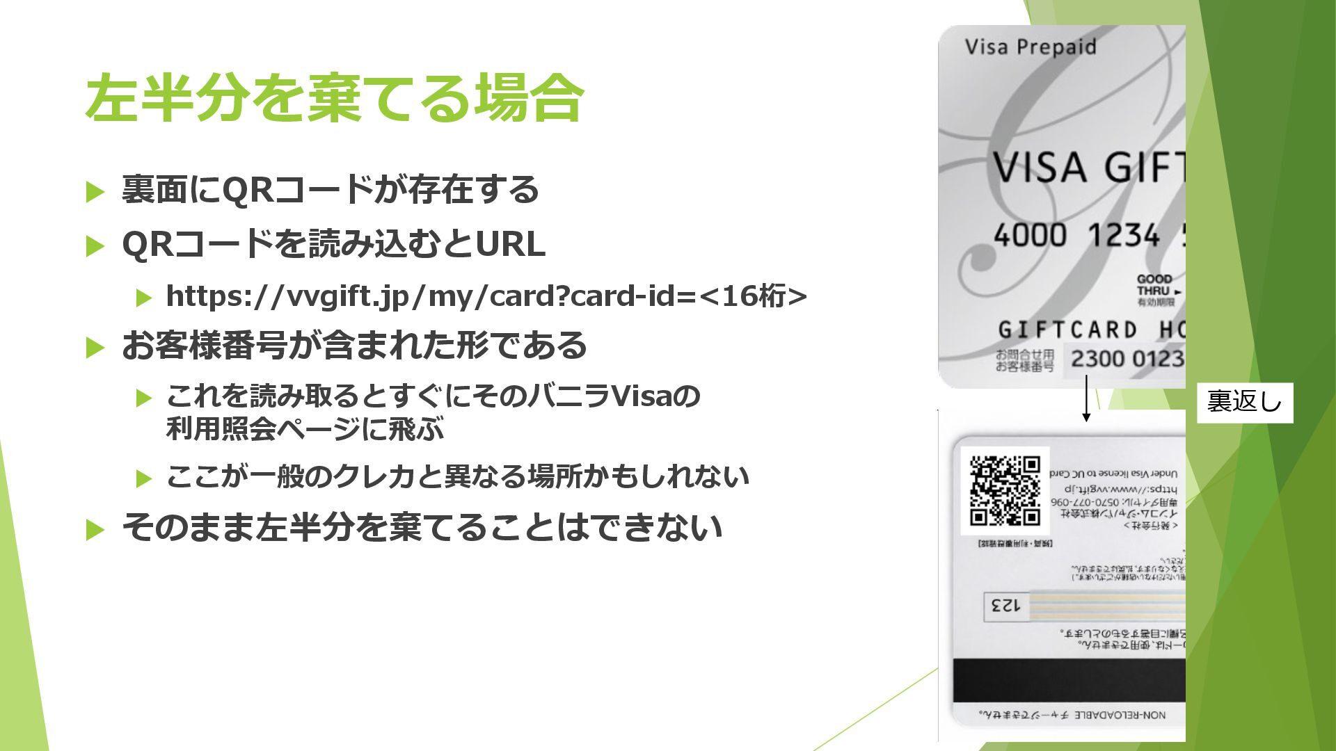 これを読み取るとすぐにそのバニラVisaの 利⽤照会ページに⾶ぶ u ここが⼀般のクレカと異なる場所かもしれない u そのまま左半分を棄てることはできない 裏返し