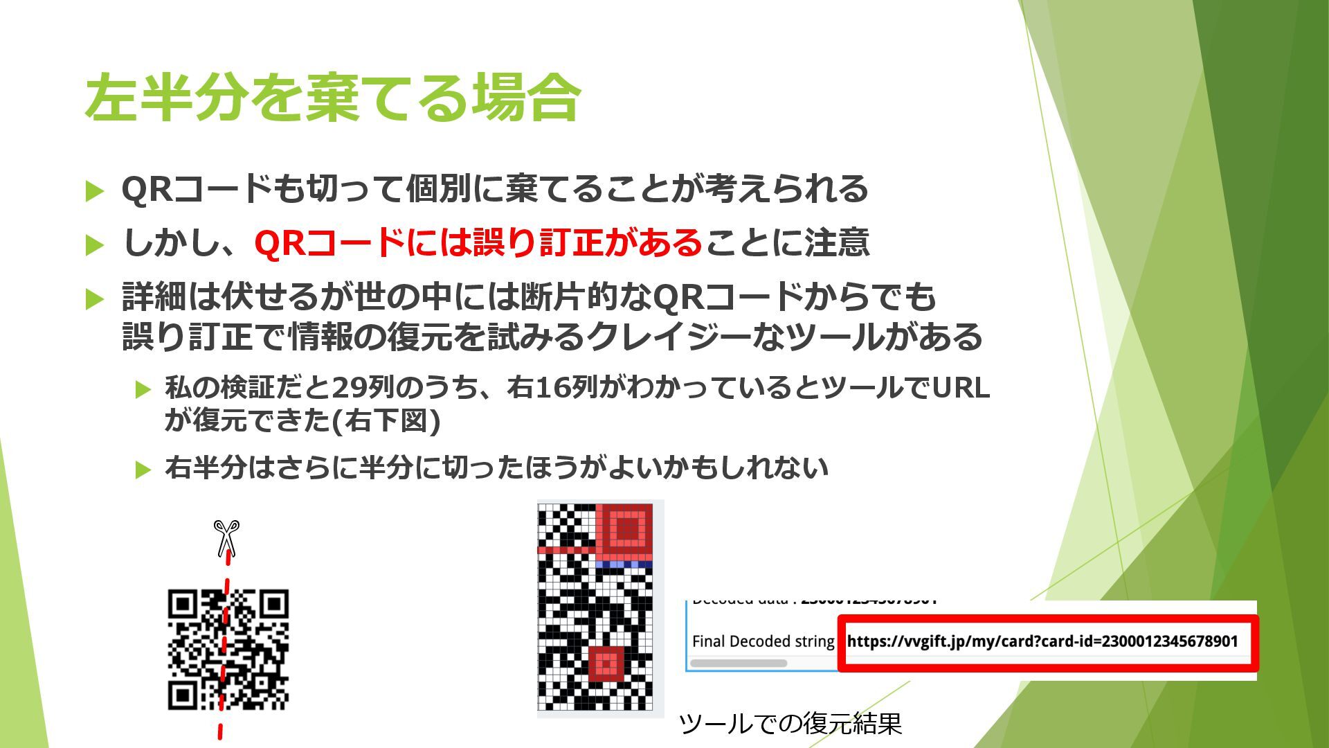 左半分を棄てる場合 u QRコードも切って個別に棄てることが考えられる u しかし、QRコードには誤り訂正があることに注意 u 詳細は伏せるが世の中には断⽚的なQRコードからでも 誤り訂正で情報の復元を試みるクレイジーなツールがある u 私の検証だと29列のうち、右16列がわかっているとツールでURL