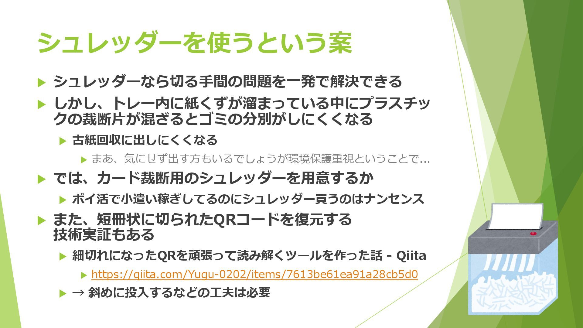 u では、カード裁断⽤のシュレッダーを⽤意するか u ポイ活で⼩遣い稼ぎしてるのにシュレッダー買うのはナンセンス u また、短冊状に切られたQRコードを復元する 技術実証もある u 細切れになったQRを頑張って読み解くツールを作った話 - Qiita u https://qiita.com/Yugu-0202/items/7613be61ea91a28cb5d0 u → 斜めに投⼊するなどの⼯夫は必要
