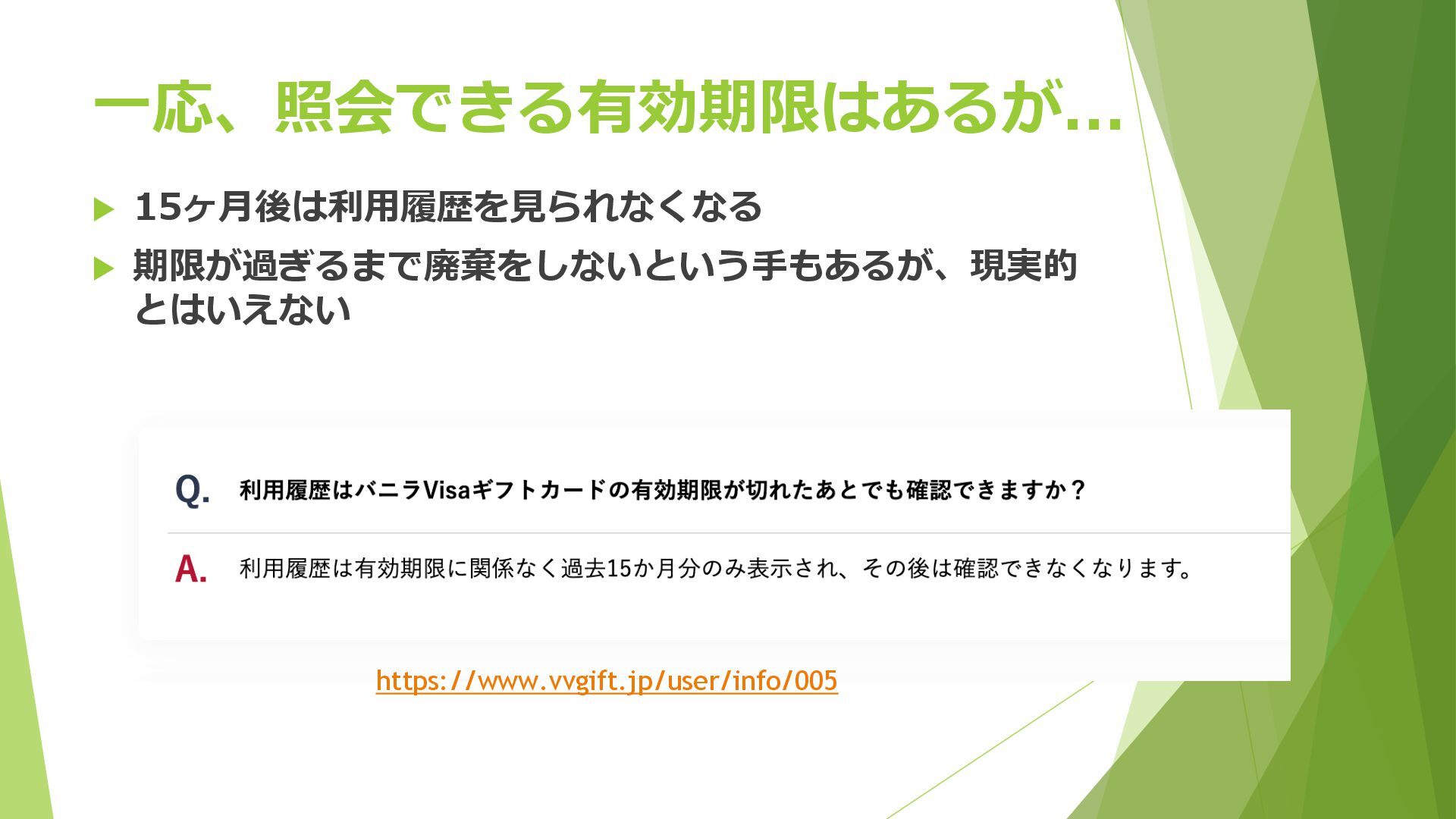 ⼀応、照会できる有効期限はあるが... u 15ヶ⽉後は利⽤履歴を⾒られなくなる u 期限が過ぎるまで廃棄をしないという⼿もあるが、現実的 とはいえない https://www.vvgift.jp/user/info/005