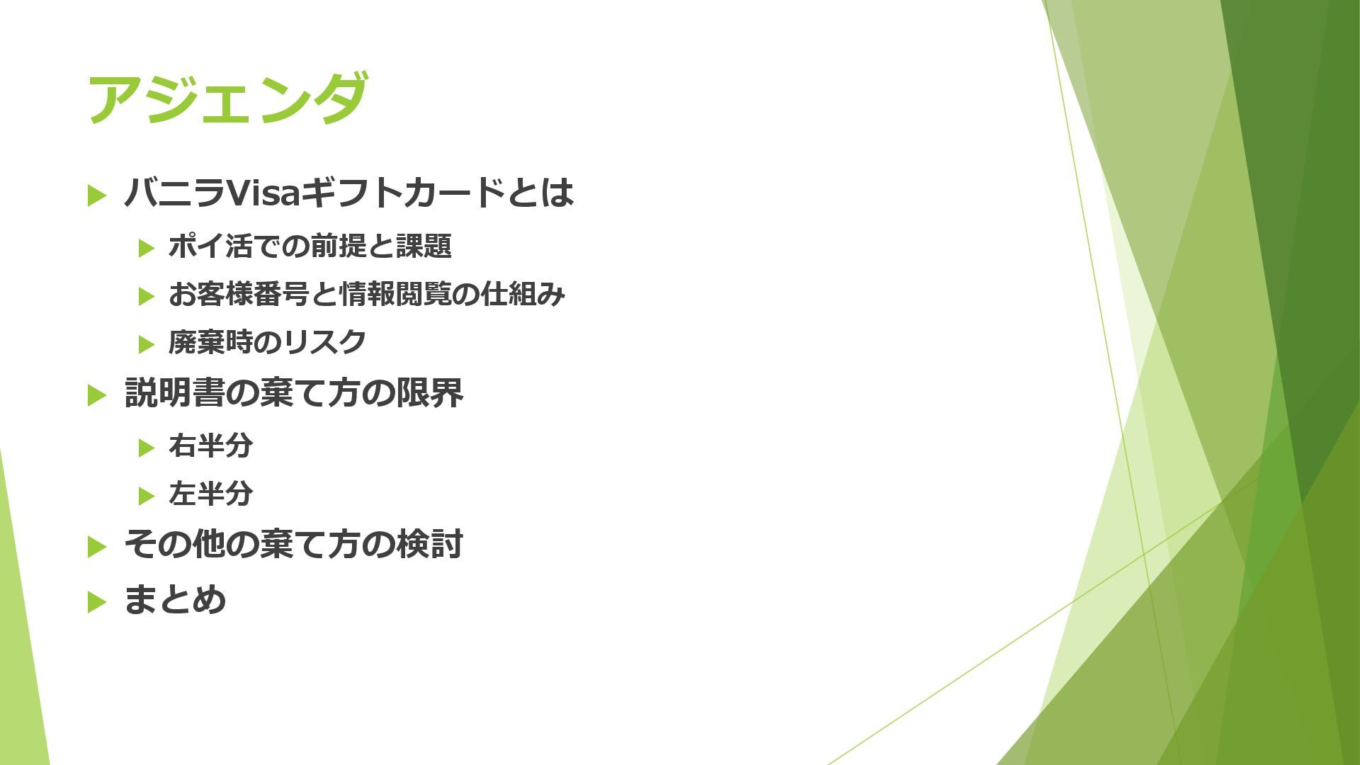 アジェンダ u バニラVisaギフトカードとは u ポイ活での前提と課題 u お客様番号と情報閲覧の仕組み u 廃棄時のリスク u