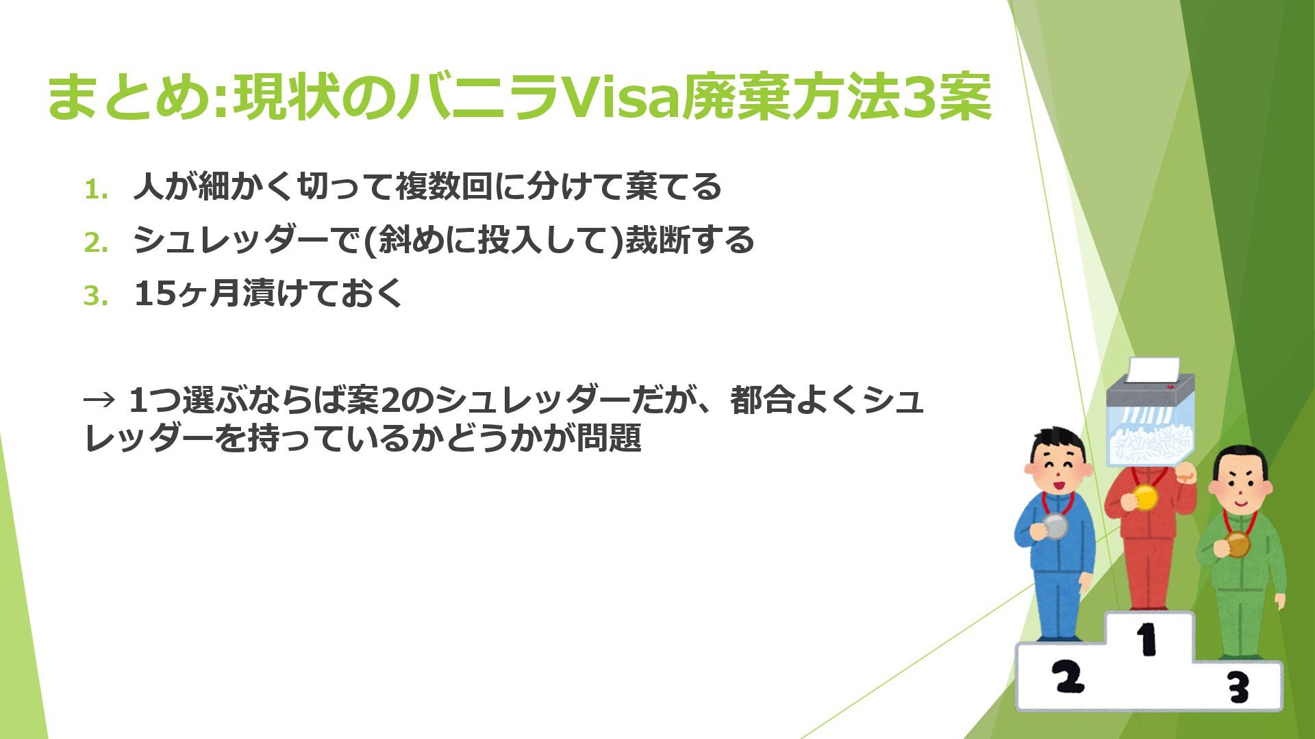 まとめ:現状のバニラVisa廃棄⽅法3案 1. ⼈が細かく切って複数回に分けて棄てる 2. シュレッダーで(斜めに投⼊して)裁断する 3. 15ヶ⽉漬けておく → 1つ選ぶならば案2のシュレッダーだが、都合よくシュ レッダーを持っているかどうかが問題