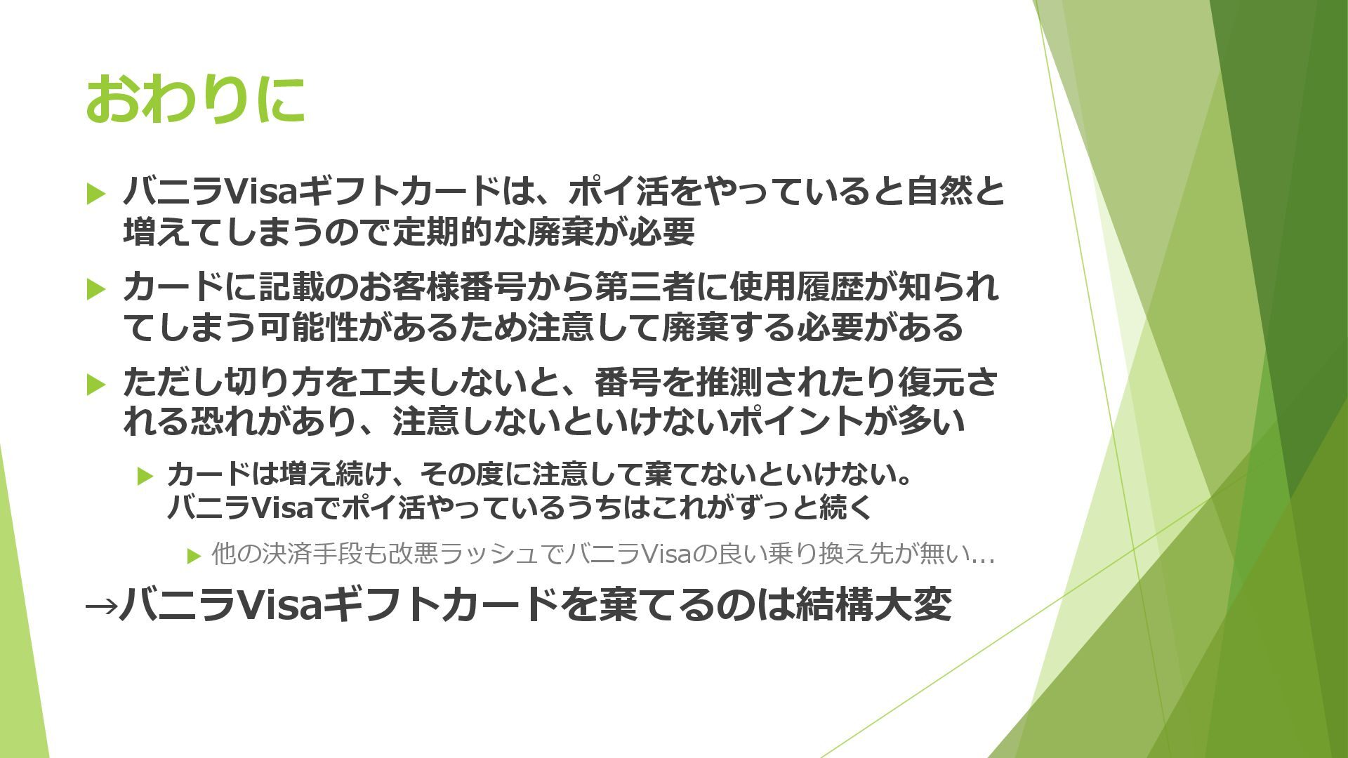 おわりに u バニラVisaギフトカードは、ポイ活をやっていると⾃然と 増えてしまうので定期的な廃棄が必要 u カードに記載のお客様番号から第三者に使⽤履歴が知られ てしまう可能性があるため注意して廃棄する必要がある u ただし切り⽅を⼯夫しないと、番号を推測されたり復元さ れる恐れがあり、注意しないといけないポイントが多い