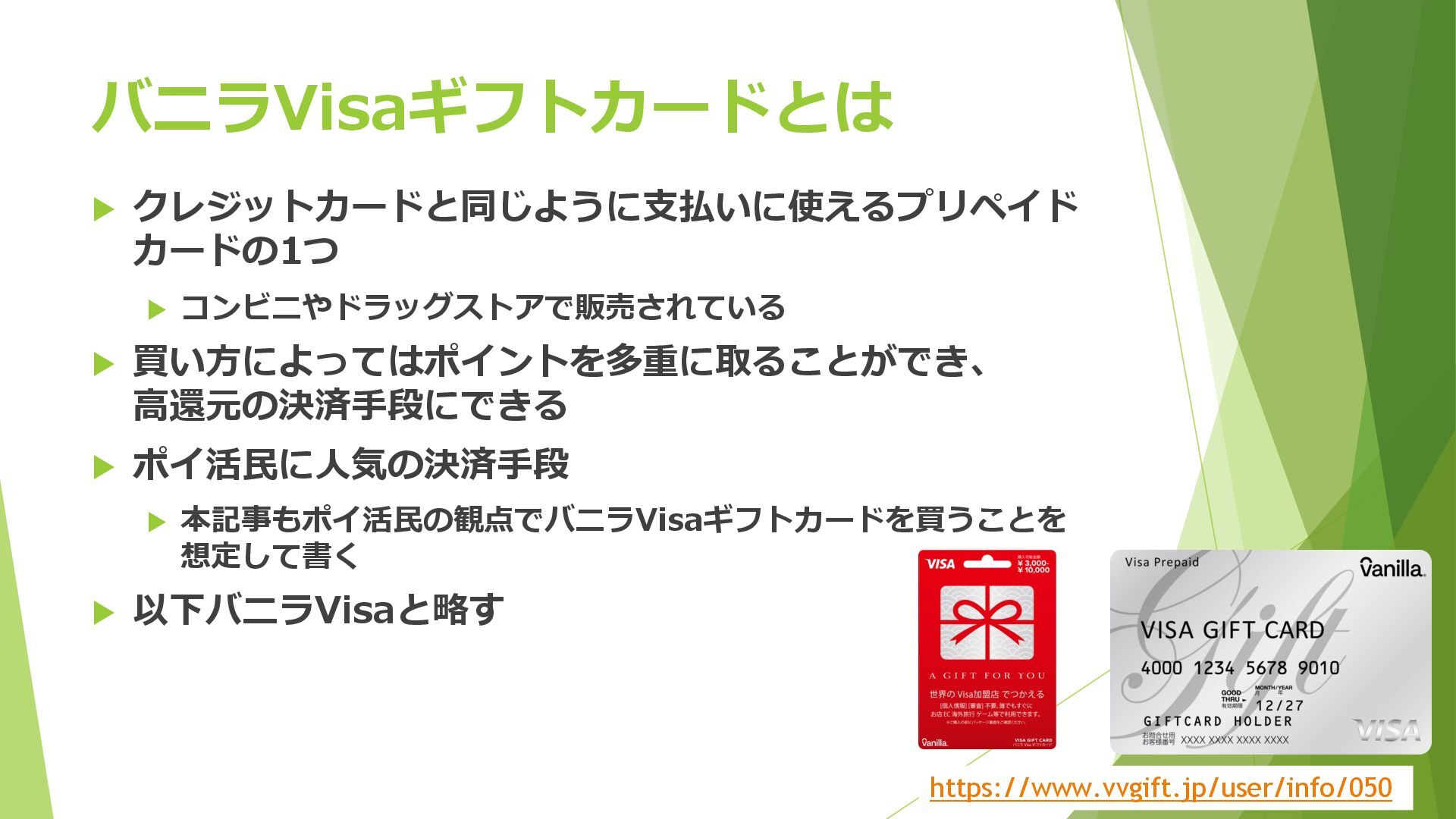 ポイ活⺠に⼈気の決済⼿段 u 本記事もポイ活⺠の観点でバニラVisaギフトカードを買うことを 想定して書く u 以下バニラVisaと略す https://www.vvgift.jp/user/info/050