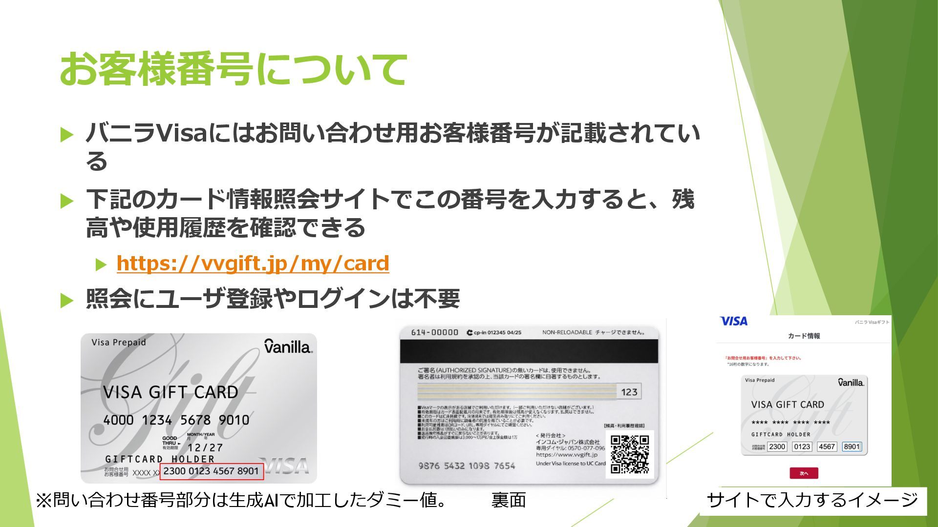 お客様番号について u バニラVisaにはお問い合わせ⽤お客様番号が記載されてい る u 下記のカード情報照会サイトでこの番号を⼊⼒すると、残 ⾼や使⽤履歴を確認できる u https://vvgift.jp/my/card u