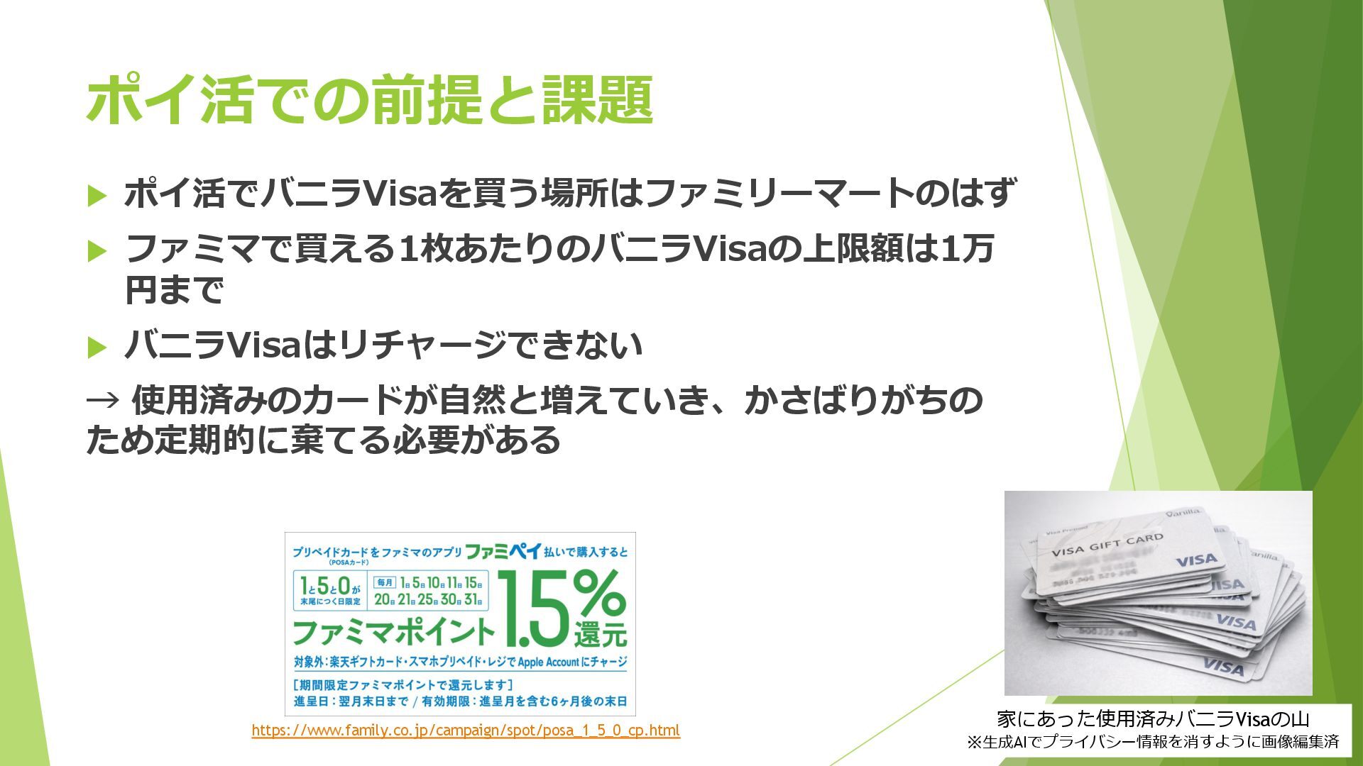 ポイ活での前提と課題 u ポイ活でバニラVisaを買う場所はファミリーマートのはず u ファミマで買える1枚あたりのバニラVisaの上限額は1万 円まで u バニラVisaはリチャージできない → 使⽤済みのカードが⾃然と増えていき、かさばりがちの