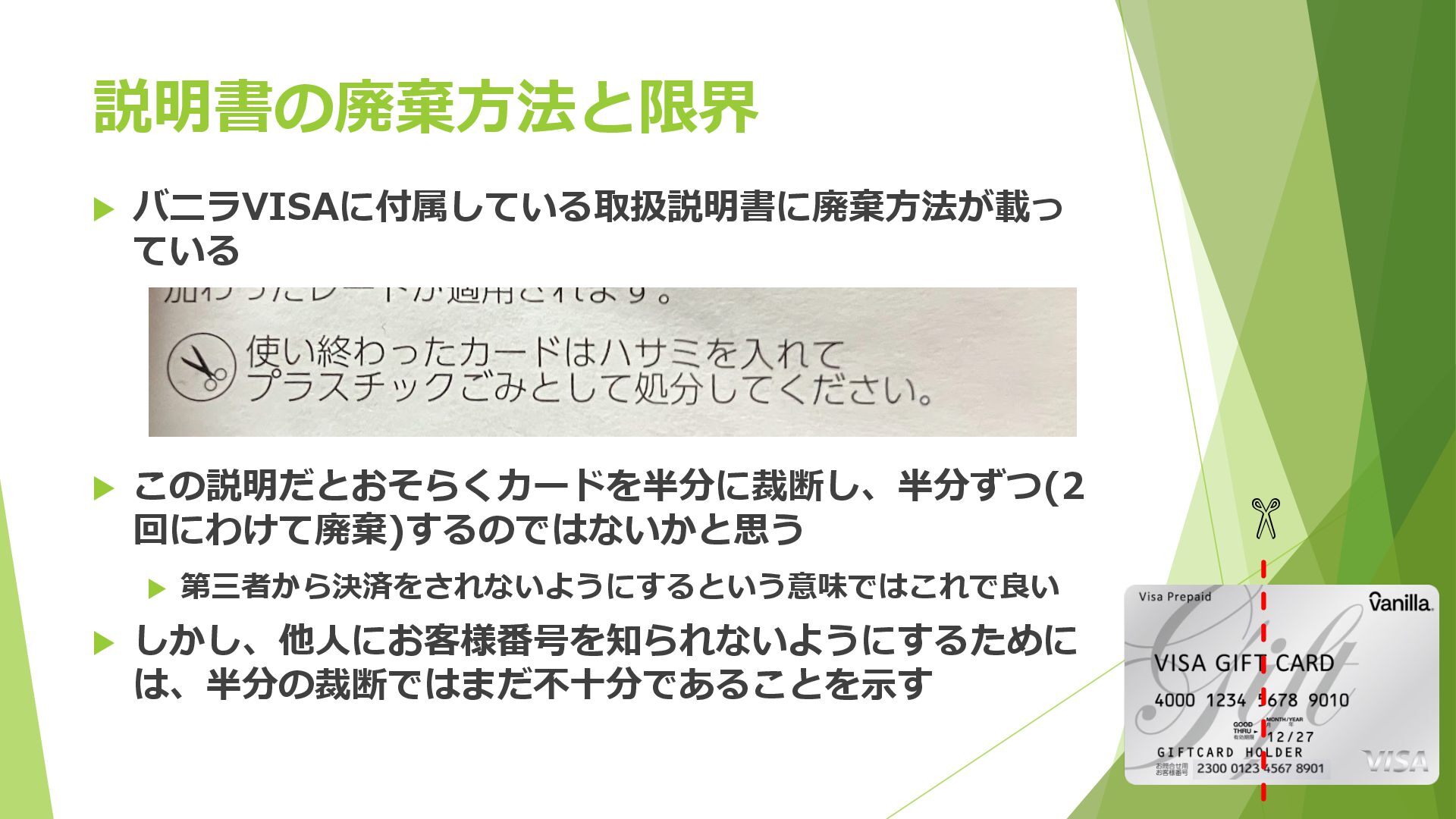 説明書の廃棄⽅法と限界 u バニラVISAに付属している取扱説明書に廃棄⽅法が載っ ている u この説明だとおそらくカードを半分に裁断し、半分ずつ(2 回にわけて廃棄)するのではないかと思う u 第三者から決済をされないようにするという意味ではこれで良い u
