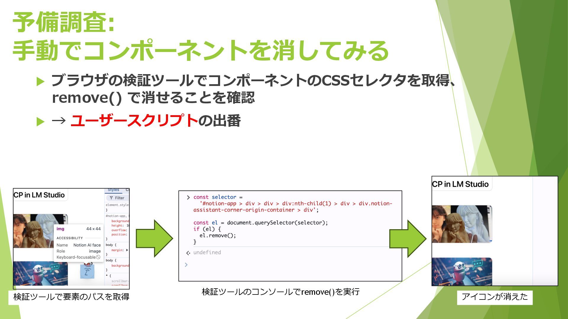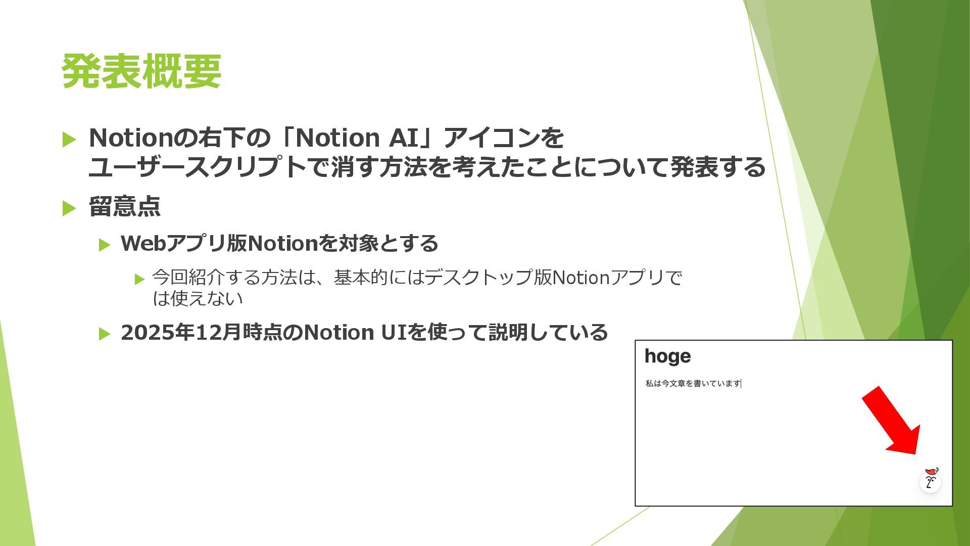 発表概要 u Notionの右下の「Notion AI」アイコンを ユーザースクリプトで消す⽅法を考えたことについて発表する u 留意点 u Webアプリ版Notionを対象とする u
