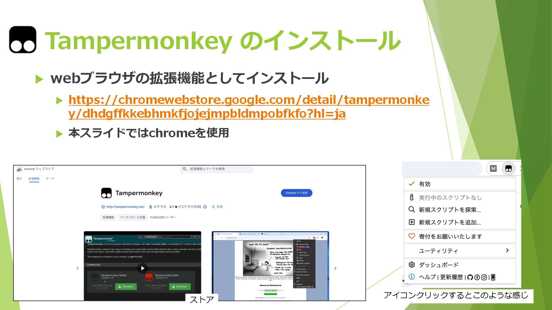 Tampermonkey のインストール u webブラウザの拡張機能としてインストール u https://chromewebstore.google.com/detail/tampermonke y/dhdgffkkebhmkfjojejmpbldmpobfkfo?hl=ja u 本スライドではchromeを使⽤ アイコンクリックするとこのような感じ