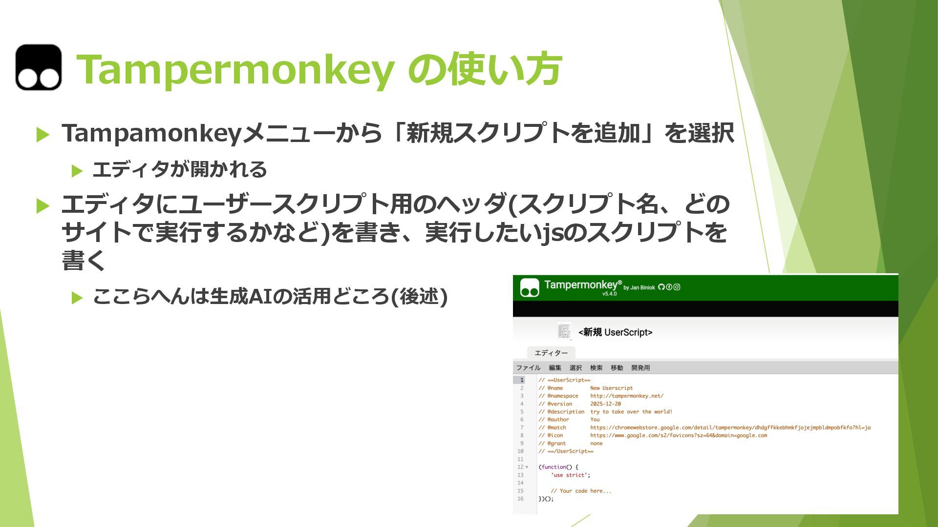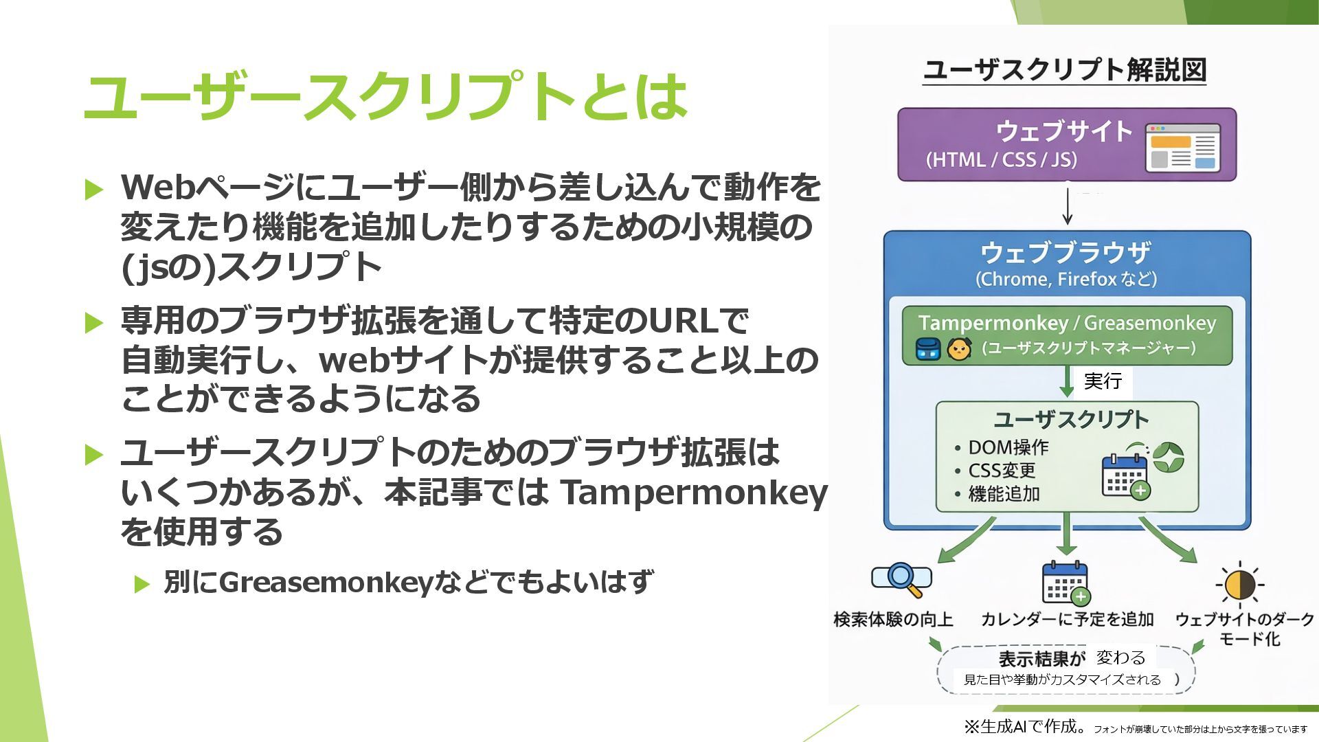 ユーザースクリプトのためのブラウザ拡張は いくつかあるが、本記事では Tampermonkey を使⽤する u 別にGreasemonkeyなどでもよいはず ※⽣成AIで作成。フォントが崩壊していた部分は上から⽂字を張っています 実⾏ 変わる ⾒た⽬や挙動がカスタマイズされる