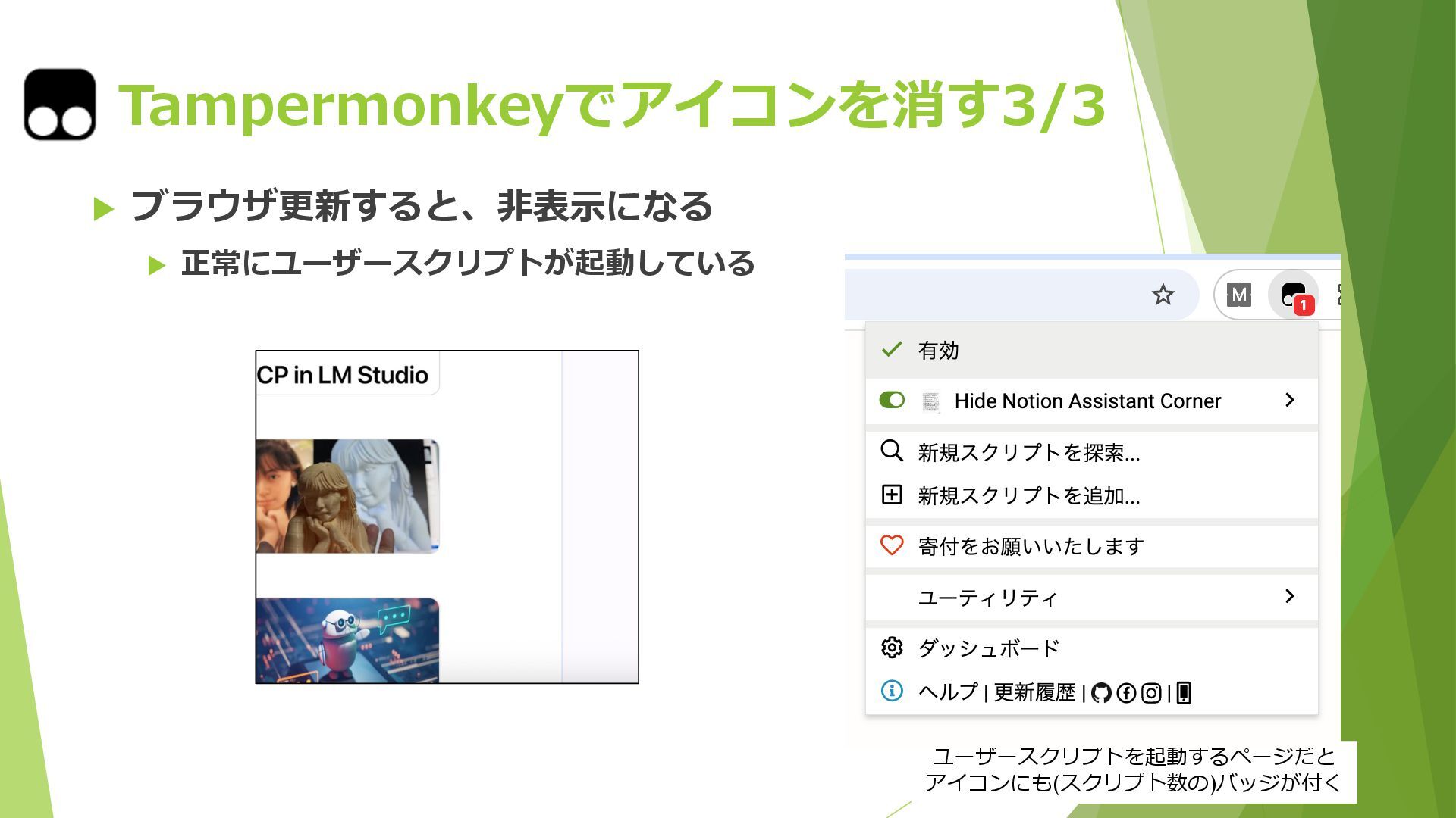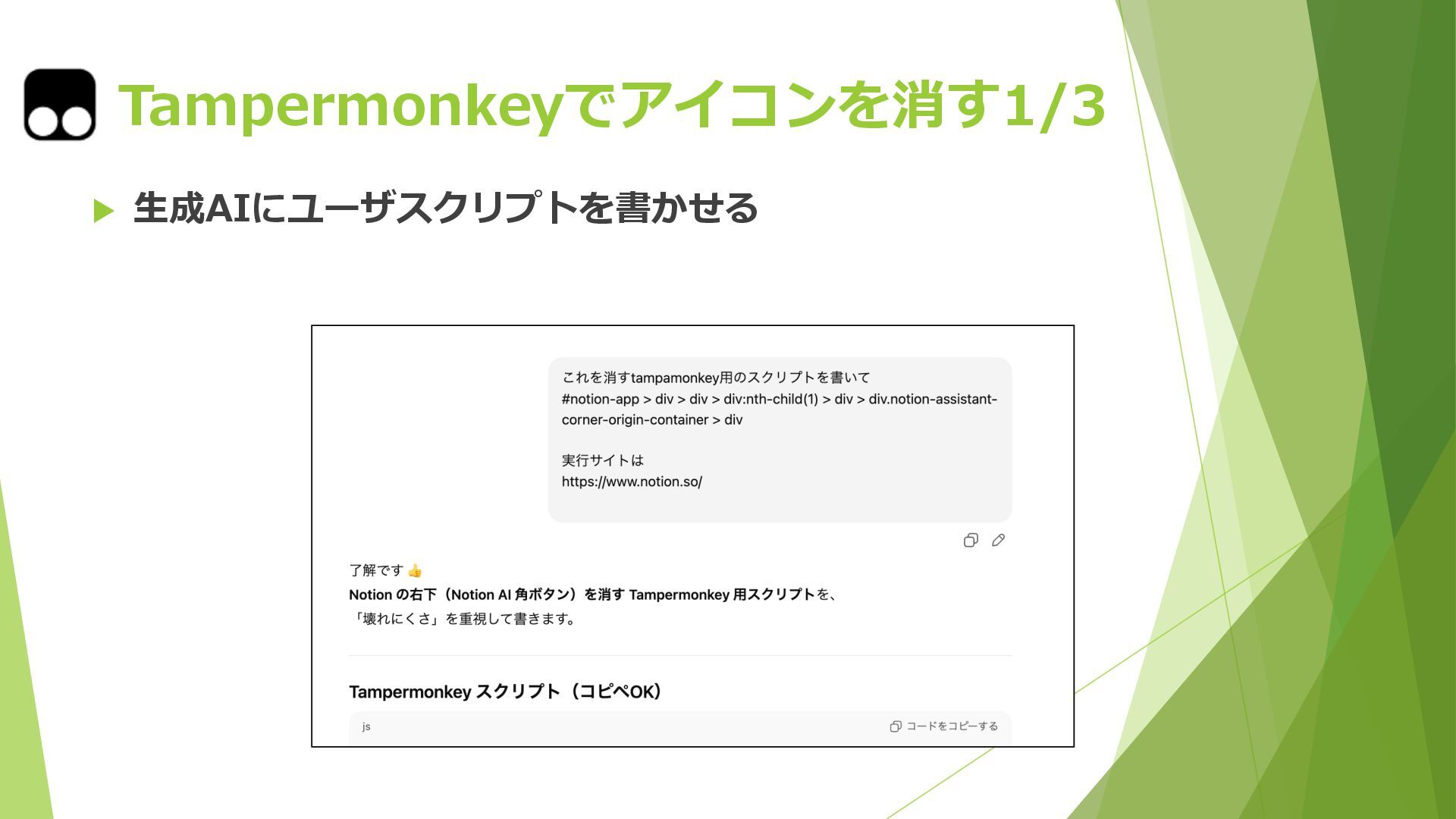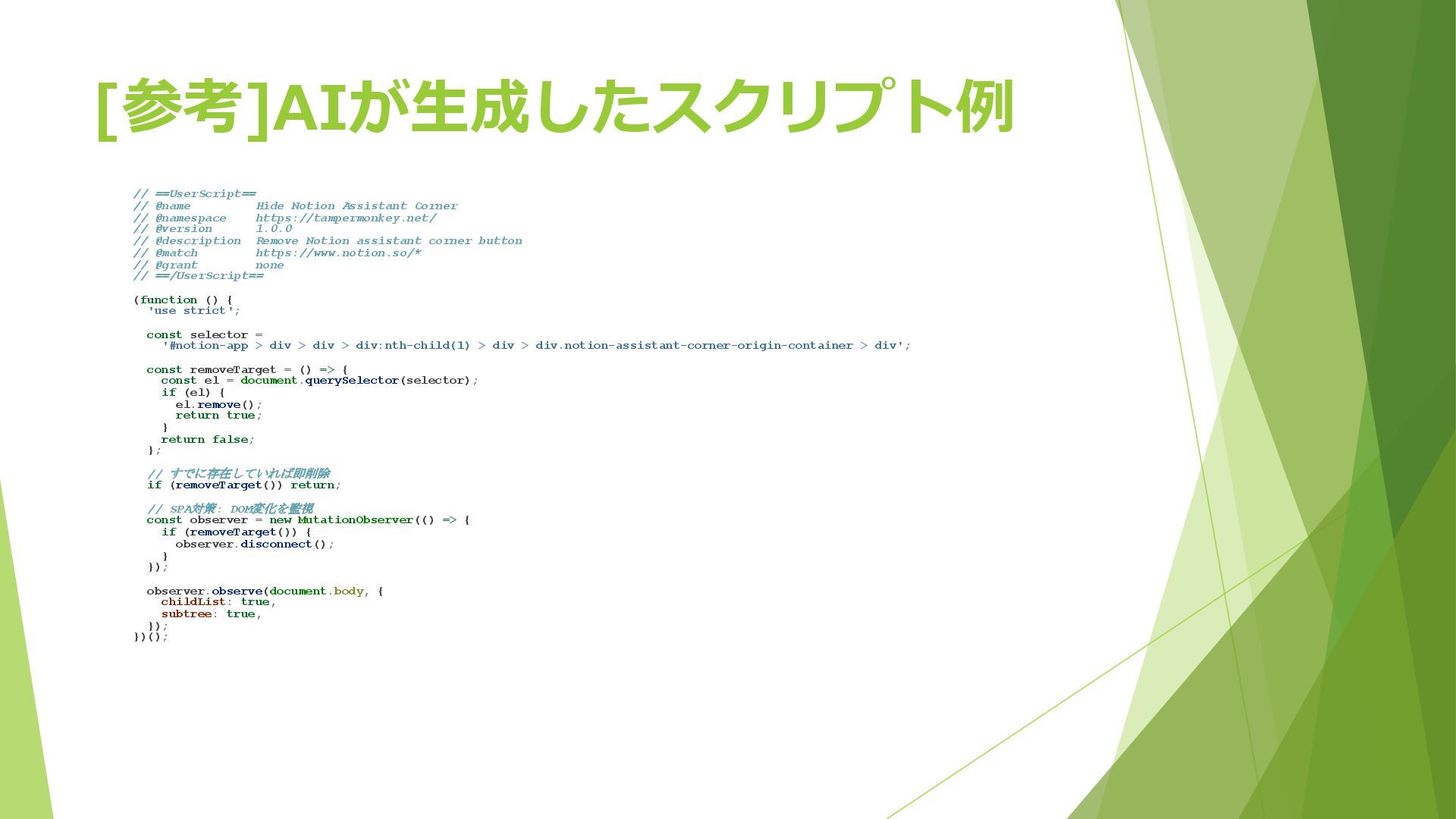[参考]AIが⽣成したスクリプト例 // ==UserScript== // @name Hide Notion Assistant Corner //