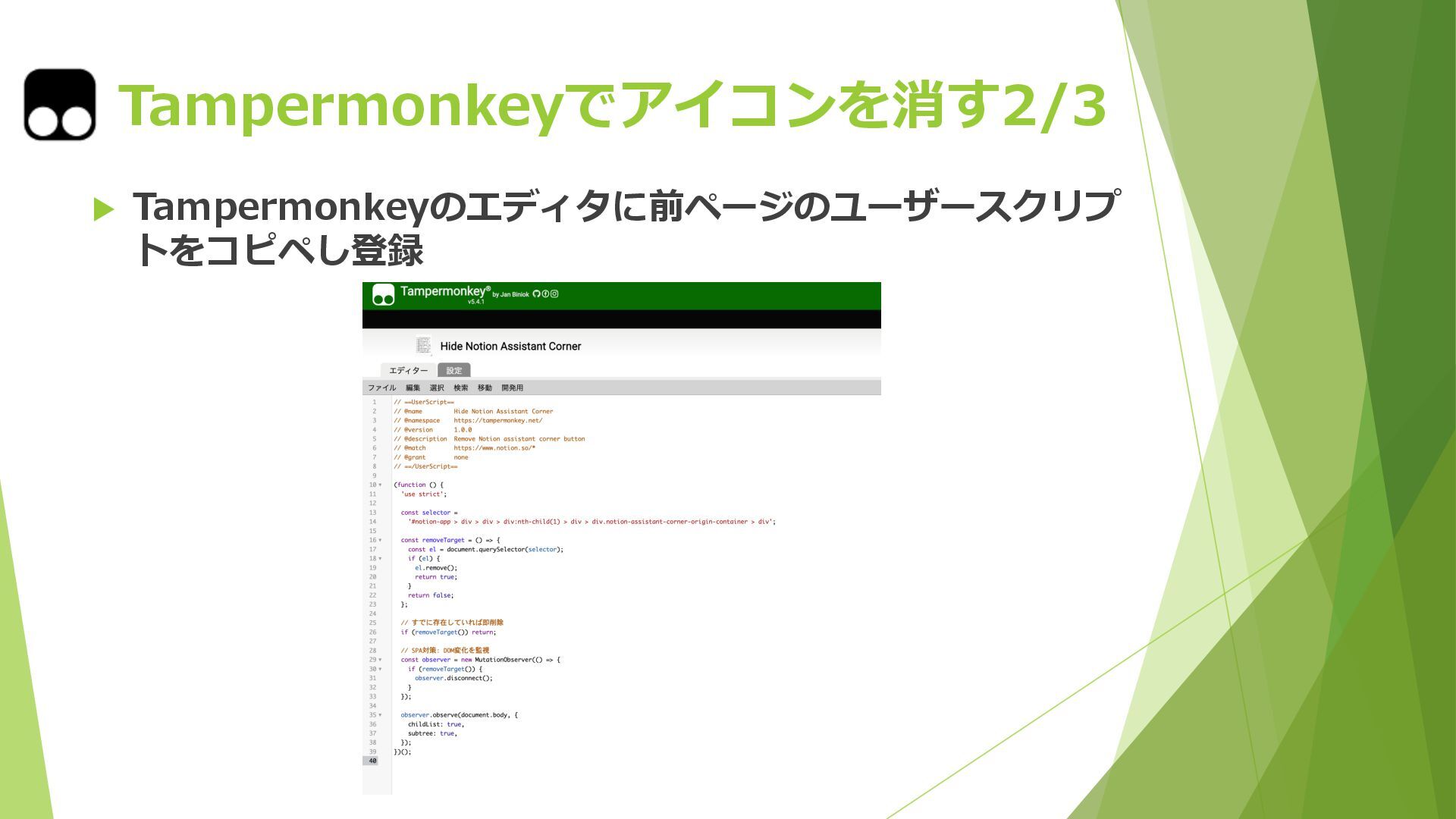 Tampermonkeyでアイコンを消す2/3 u Tampermonkeyのエディタに前ページのユーザースクリプ トをコピペし登録