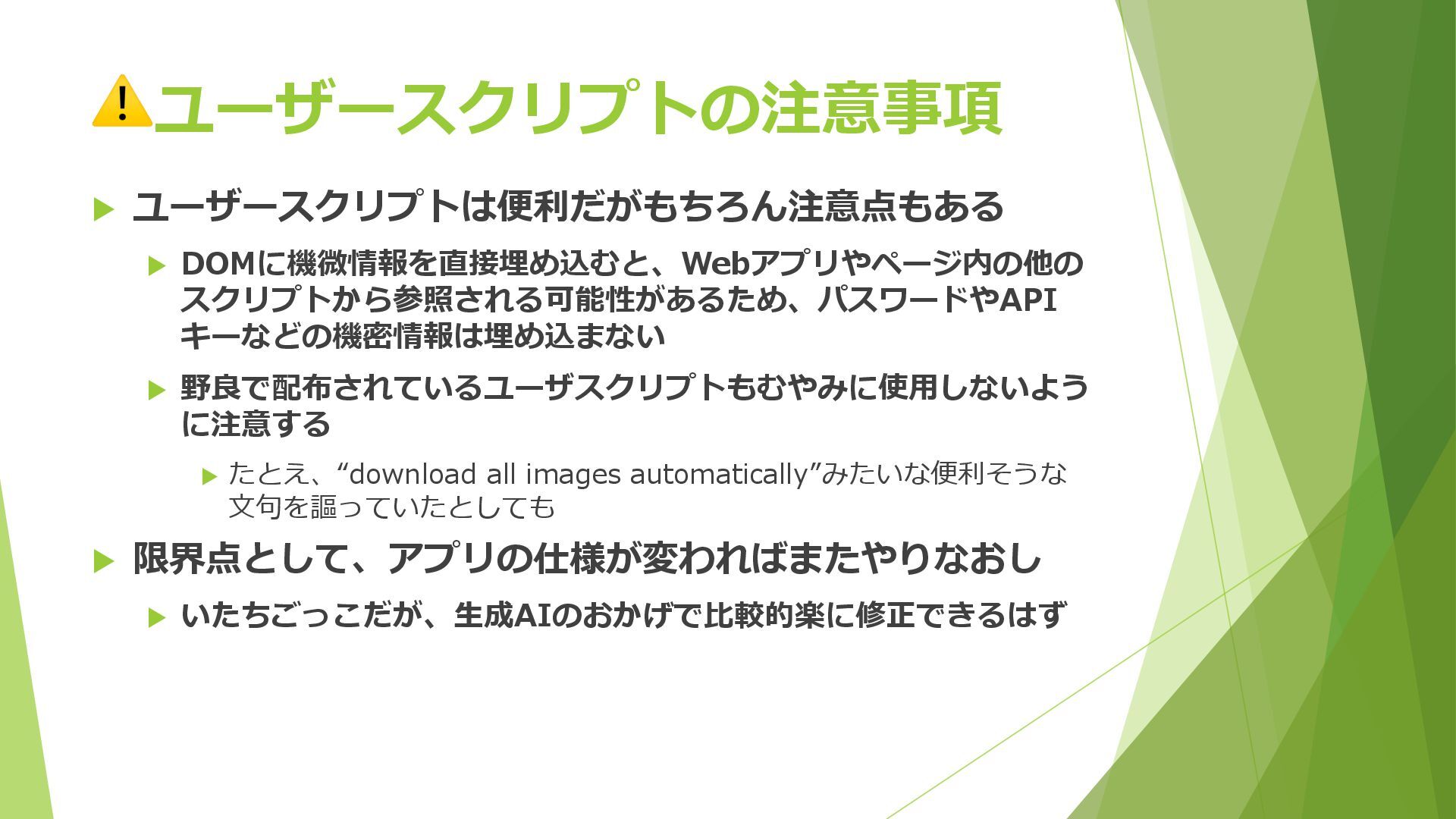 ⚠ユーザースクリプトの注意事項 u ユーザースクリプトは便利だがもちろん注意点もある u DOMに機微情報を直接埋め込むと、Webアプリやページ内の他の スクリプトから参照される可能性があるため、パスワードやAPI キーなどの機密情報は埋め込まない u 野良で配布されているユーザスクリプトもむやみに使⽤しないよう に注意する