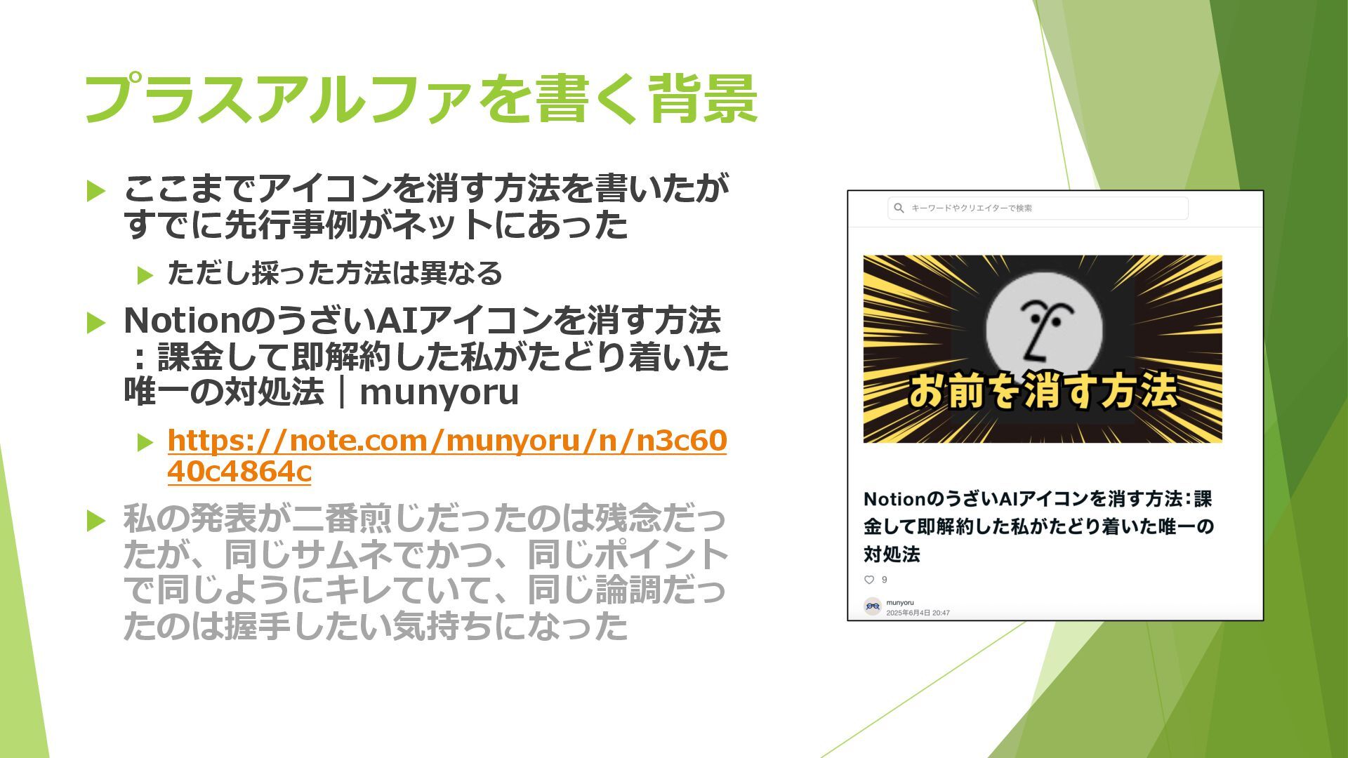 プラスアルファを書く背景 u ここまでアイコンを消す⽅法を書いたが すでに先⾏事例がネットにあった u ただし採った⽅法は異なる u NotionのうざいAIアイコンを消す⽅法 ︓課⾦して即解約した私がたどり着いた 唯⼀の対処法|munyoru